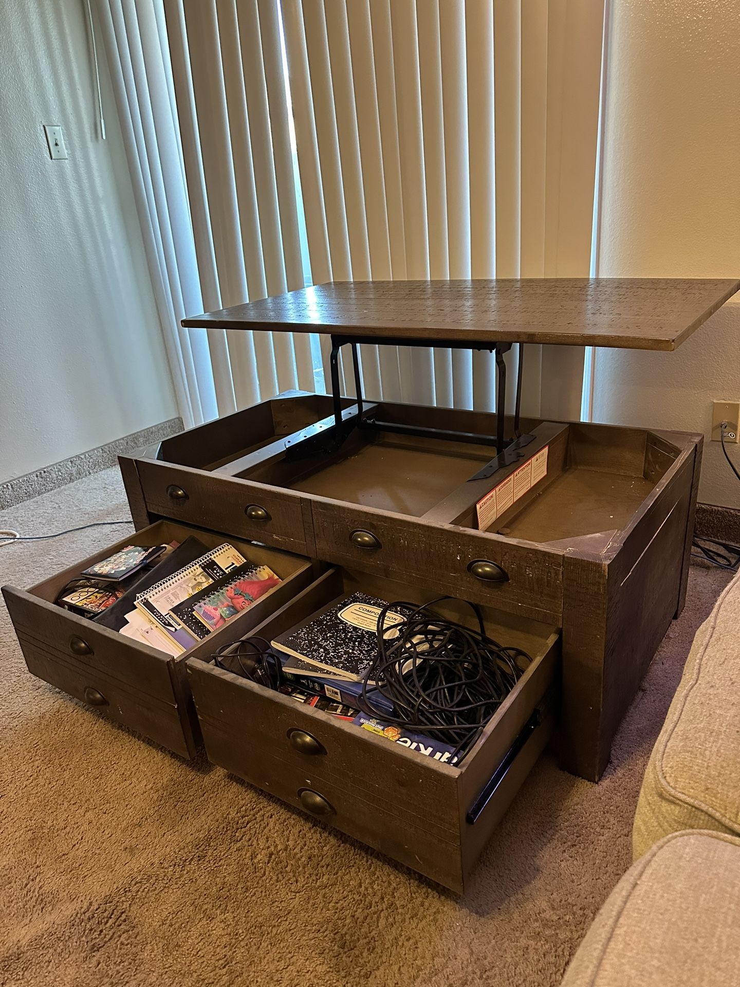 Wood rising coffee table with storage pullouts. Gently used, knicks from moving.