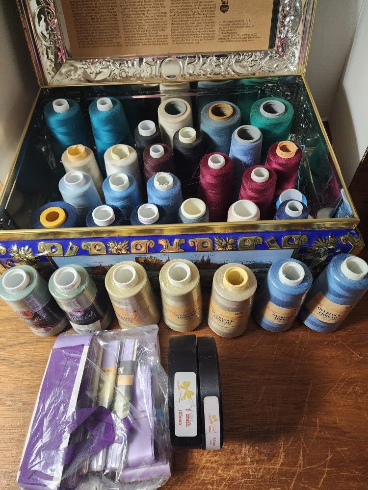These were my mom's. There are 31 different spools. Quite a few new ones. Also some different ribbon. Comes in a cute tin box. Meet up in North Snohomish County. Sometimes further north or south.