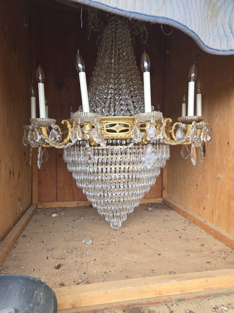 34 w/ 49 h crystal chandelier all lights work in a wood box you pack it up and come get it no shipping.