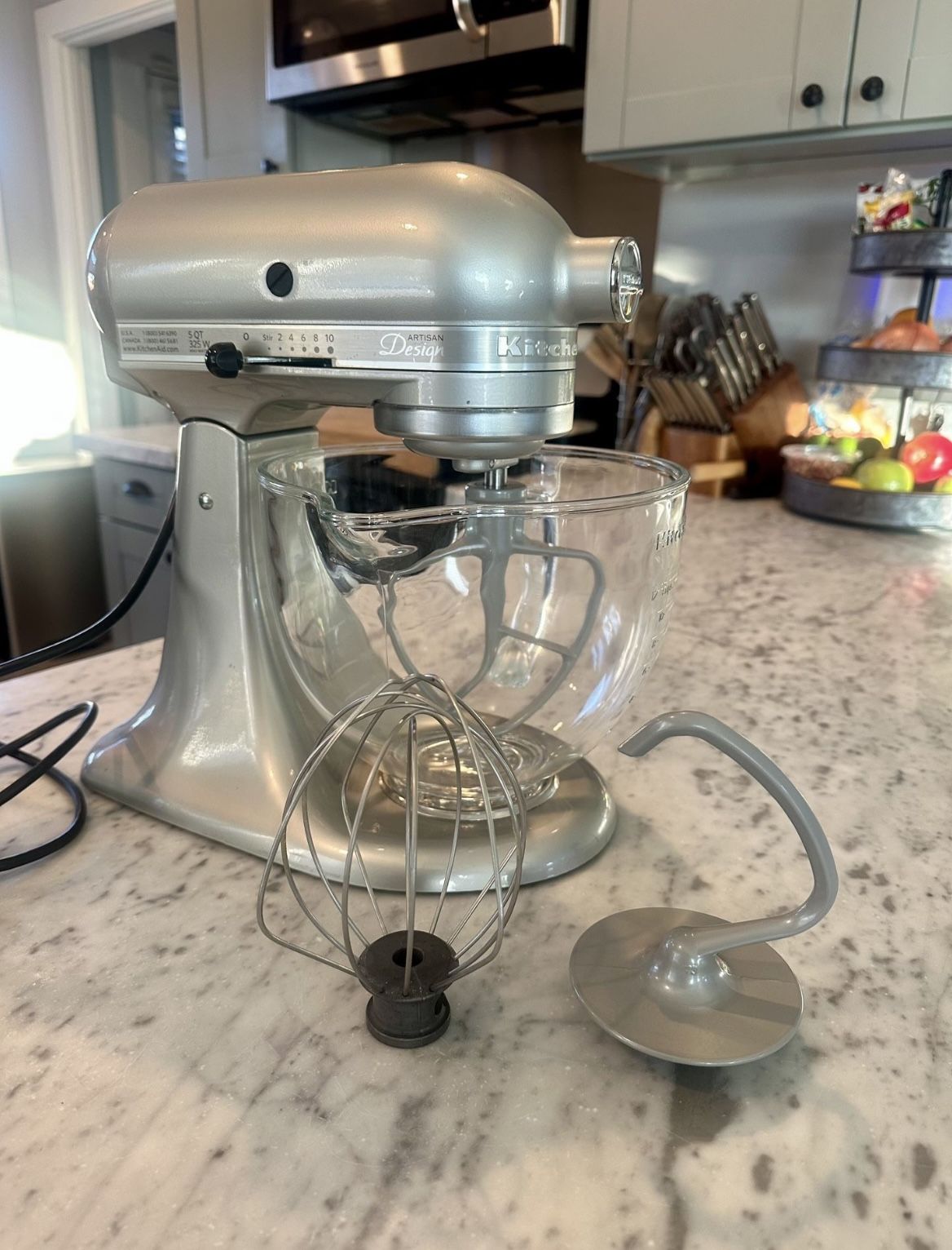 *Sugar Pearl Silver* KitchenAid 5-Qt. Artisan Design Series with Glass Bowl - Sugar Pearl Silver. Limited color - Sugar Pearl Silver. Gently used, almost new condition. Retails for $700. See photos for specifications. Works great and comes will all accessories. Located in North Park.