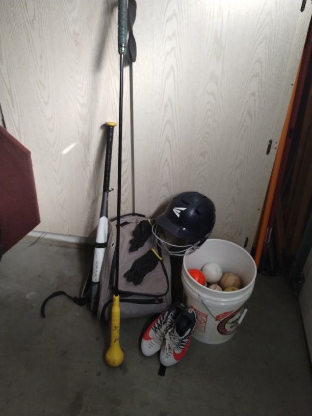 Easton 30 ounce bat 15 softballs Practice stick Easton helmet 6 3/8--7 1/8 8.5 Nike cleats 12 inch glove Gloves Softball carrying case