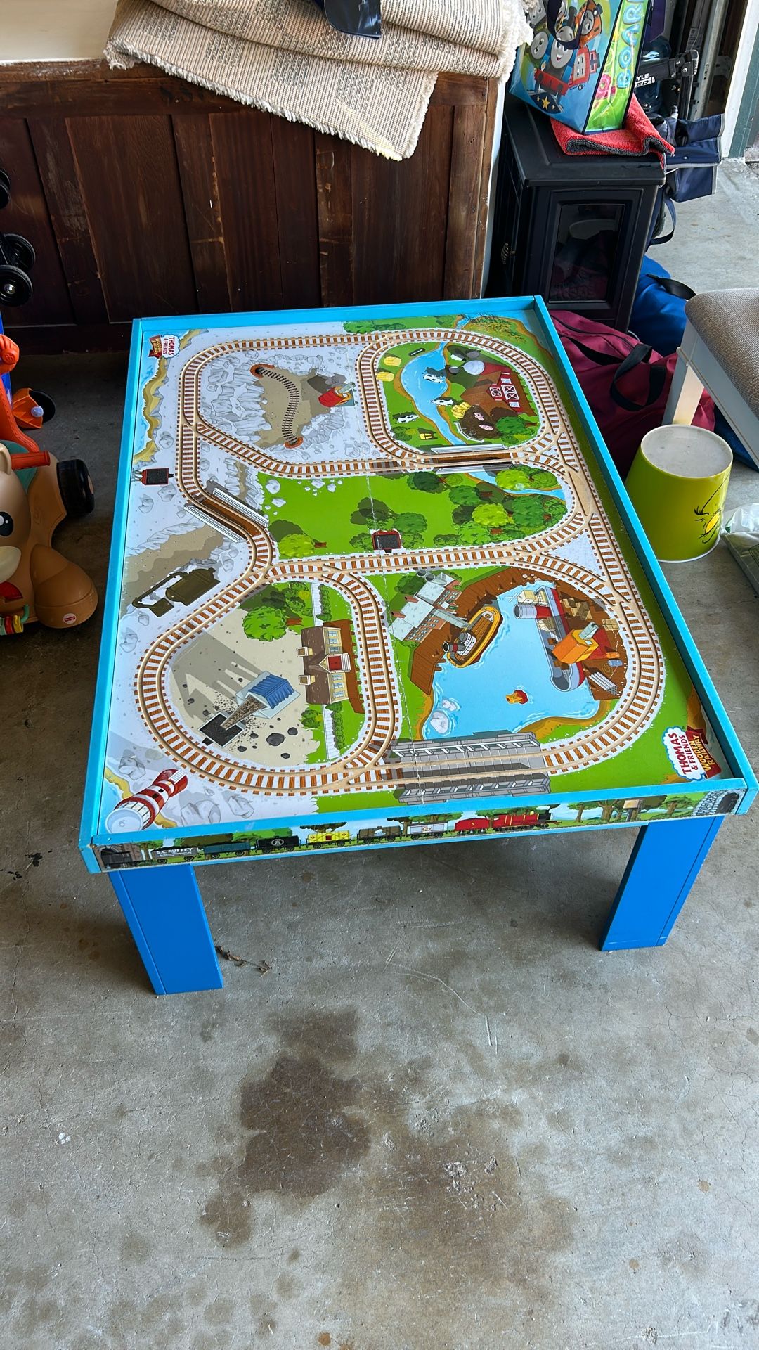 Thomas the train table comes as seen no track and no trains but is in great shape with drawer in front to hold track and trains . Top of table has track built in other side is just scenic picture but can use trains on it but no track built in on it