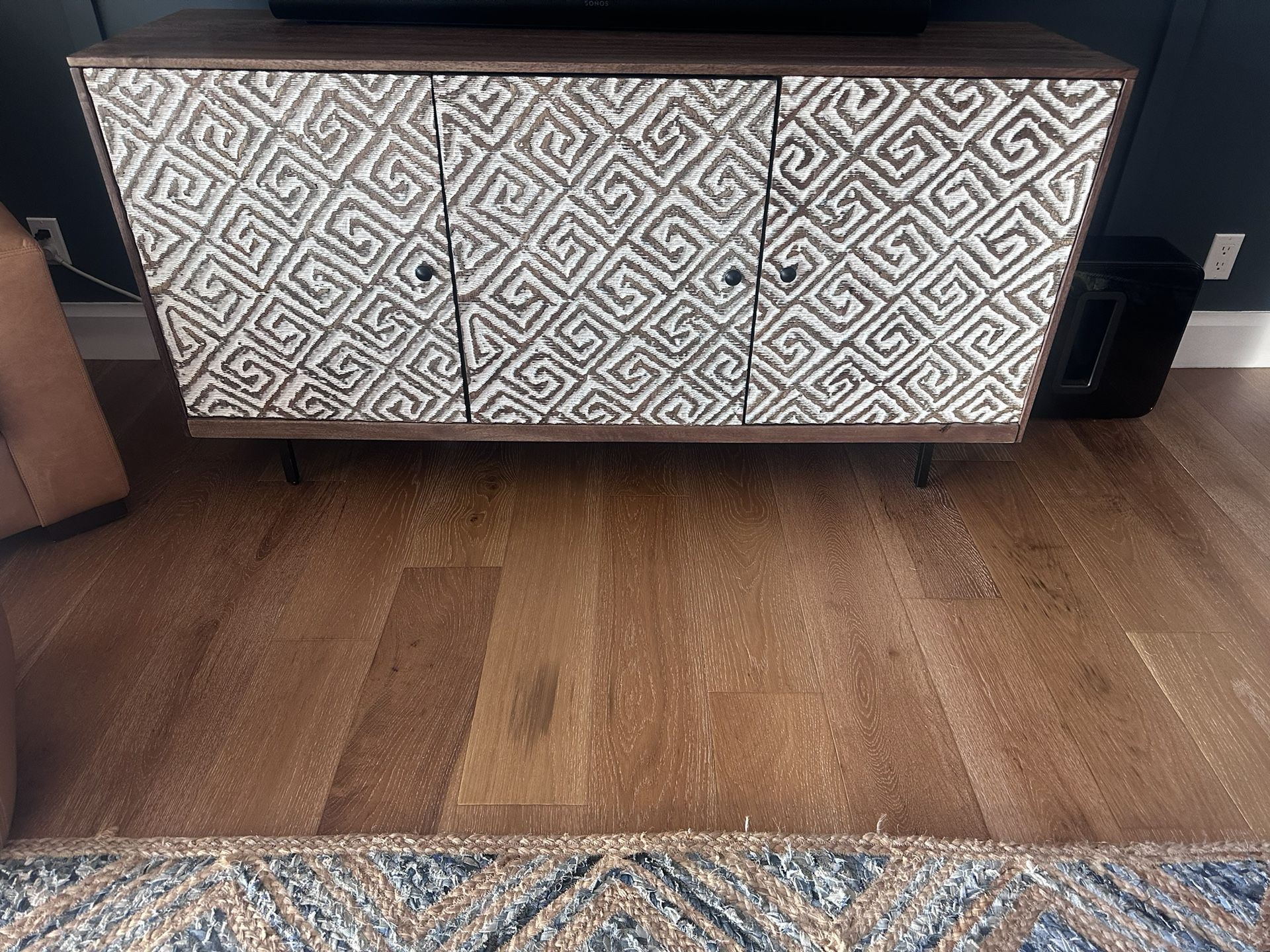 Ashley Furniture, Kerrings Accent Cabinet From a non smoking home, this is in excellent condition, except for minor discoloration inside one cabinet area. (See pictures) If you’re looking for a cool, clean-lined accent piece loaded with character, then you’ll surely want to carve out some space for the Kerrings accent cabinet. Fabulous flush-mount doors wow with their carved Greek key design for added dimension and tonal contrast. Three interior shelves accommodate your storage needs. Made of wood and engineered wood Natural, black and ivory finishes 3 doors with geometric carving and black metal knobs 3 shelves Cutouts for wire management Dimensions Width: 63.88" Height: 32.00" Depth: 18.00" Additional Dimensions Door opening (3) Width : 19.25" Door opening (3) Depth : 16.63" Door opening (3) Height : 24.75" Opening (6) Width : 19.25" Opening (6) Depth : 14.50" Opening (6) Height : 12.00" Weight 130.00 lbs (58.96 kgs)