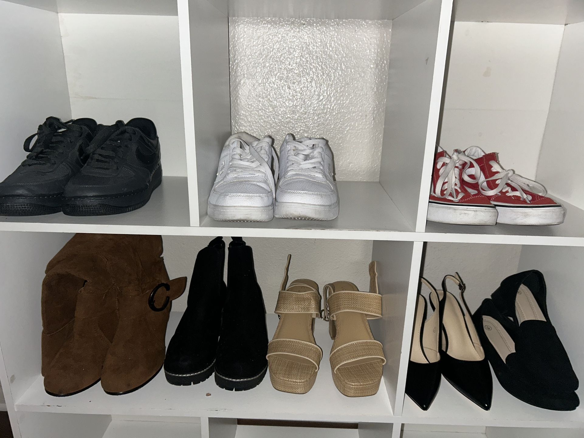 Selling some used & new shoes Black Nikes size 6.5 US NEW $65 White Flia Shoes US size 7 NEW $25 Red Vans size 6.5 NEW $30 Brown boots size 8 USED $7 Black boots size 8.5 NEW $10 Cute sandals size 7 USED $15 Black Heels size 7 USED $15 Black flat sandals size 7 USED $8