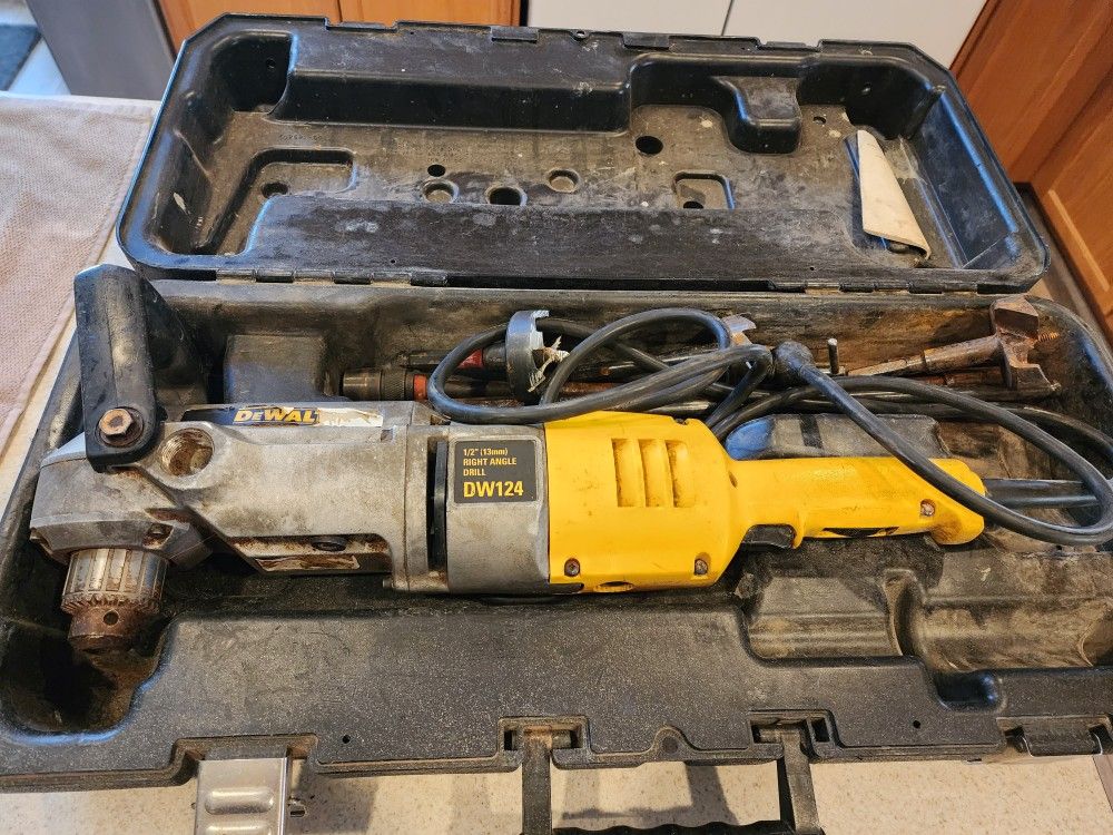 Dewalt angle drill. 1/2 inch drill bit size. With case and original instructions. The unit works great. Bits and milwaukee drill extensions included.