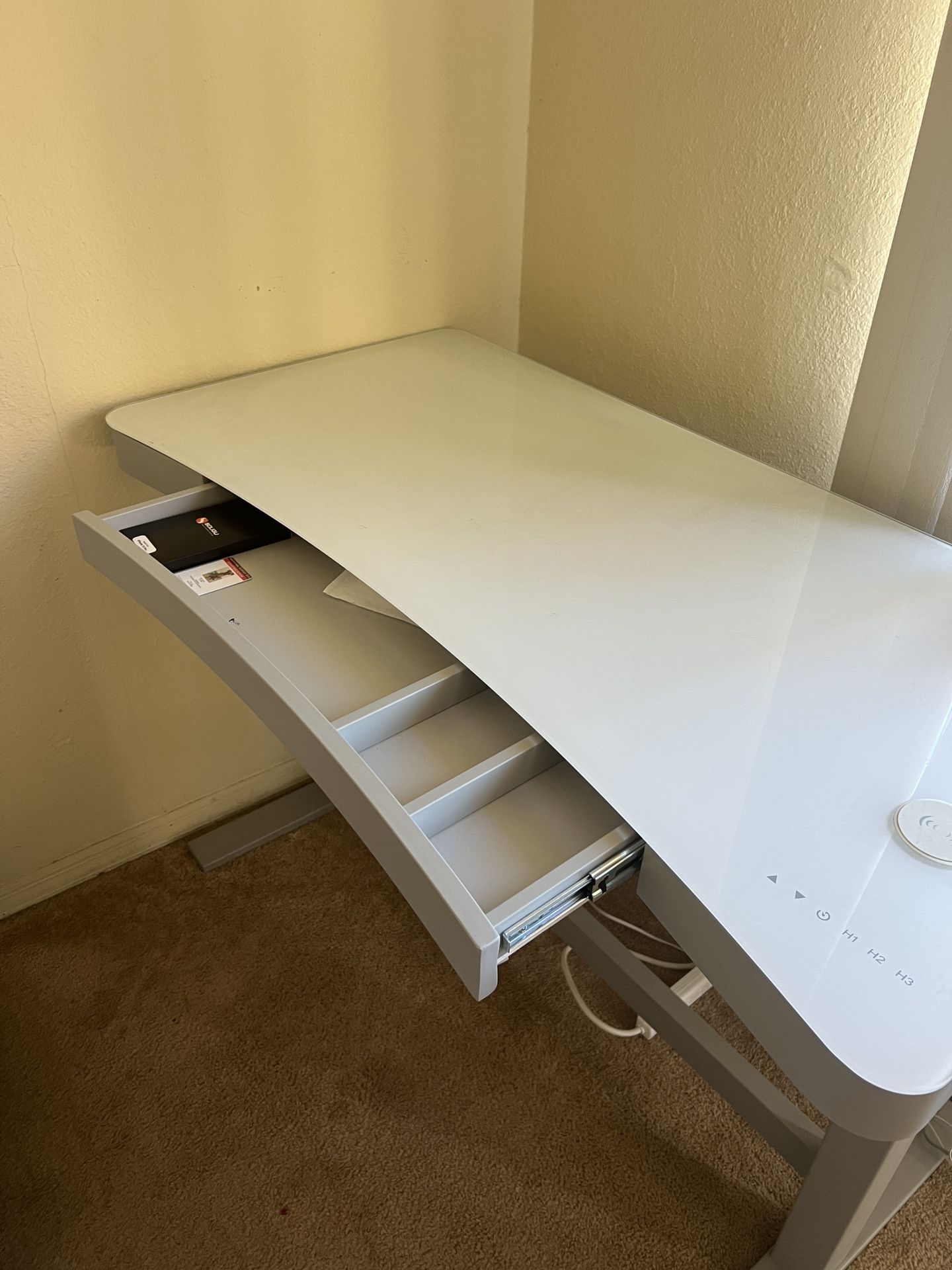 Upgrade your workspace without spending a fortune. This sleek, motorized sit/stand desk offers a premium look and built‑in tech conveniences at a bargain price. Key Features Feature Details Tempered glass top Smooth, durable surface that’s easy to clean and gives your office a modern feel. Electric height adjustment Touch controls let you raise or lower the desk at the push of a button. Save up to three preset heights (H1, H2, H3) for quick switching between sitting and standing. Wireless charging pad Integrated Qi charger on the desktop keeps compatible phones powered without messy cables. USB charging ports Built‑in side ports for keeping tablets, headphones or other devices juiced up. Organized storage Hidden drawer with dividers for pens, notepads and small accessories keeps the top clutter‑free. Sturdy steel frame Strong legs and cross‑brace provide a stable work surface whether sitting or standing. Condition • Gently used and in excellent working order. The glass shows minimal wear and the motor raises and lowers smoothly. • Comes with power cord for the motorized lift and wireless charger. • Smoke‑free home; selling because I’m downsizing. Pickup Information Asking $100 for the desk. This is for local pickup in Los Angeles only—no shipping due to size and weight. Bring a friend or a vehicle large enough to transport it safely. Send a message if you’d like dimensions or have any questions. Thanks for checking it out!
