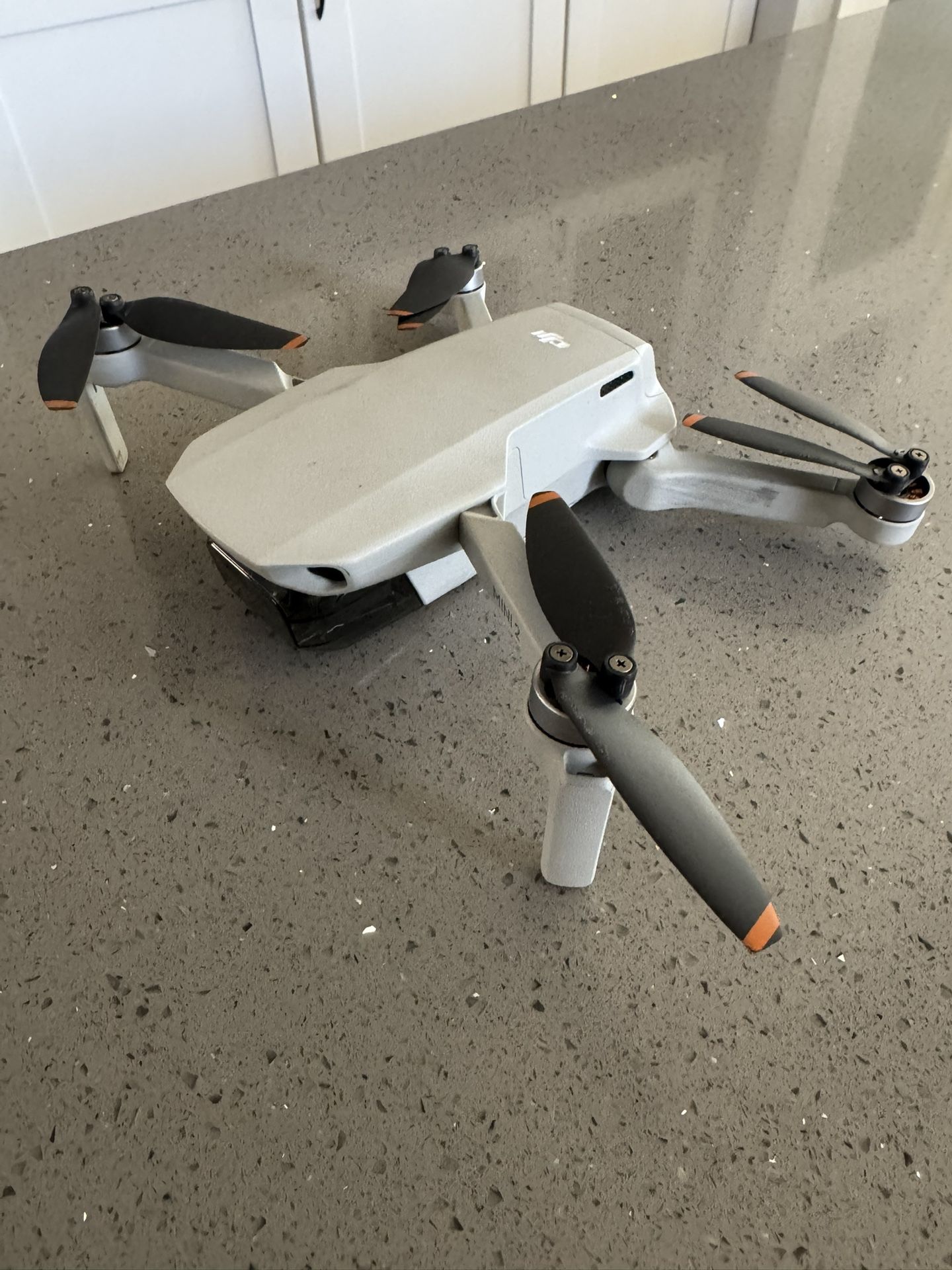 DJI mini 2 Comes with drone, controller, sun shield, 3 way battery charger, extra blades, charger cube, cables, screws for blades, adapters for different phones. Everything you could need besides the batteries. Comes with 3 batteries that don’t work and can possibly be returned to DJI