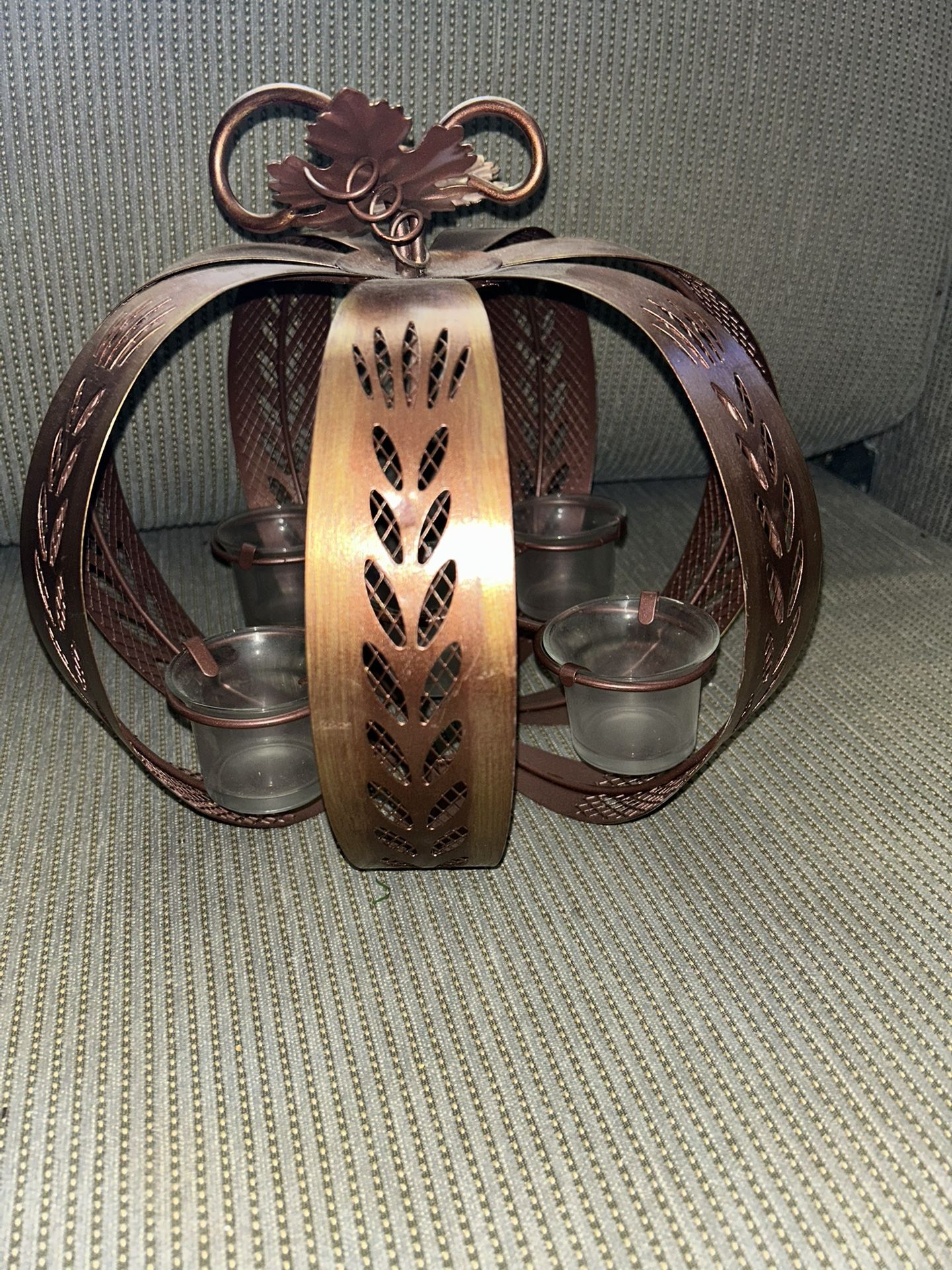 Large pumpkin copper color metal wire sculpture with 5 glass tea lite holders. Approximately 10” tall and 10” across.