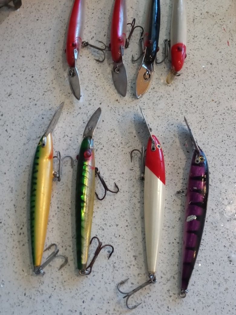 Most are new 2 wer used a couple the rapala need new hoks i have 3 or 4 gamatsu that i will throw in will trade flr 1500-3500 stradic or simular thanms