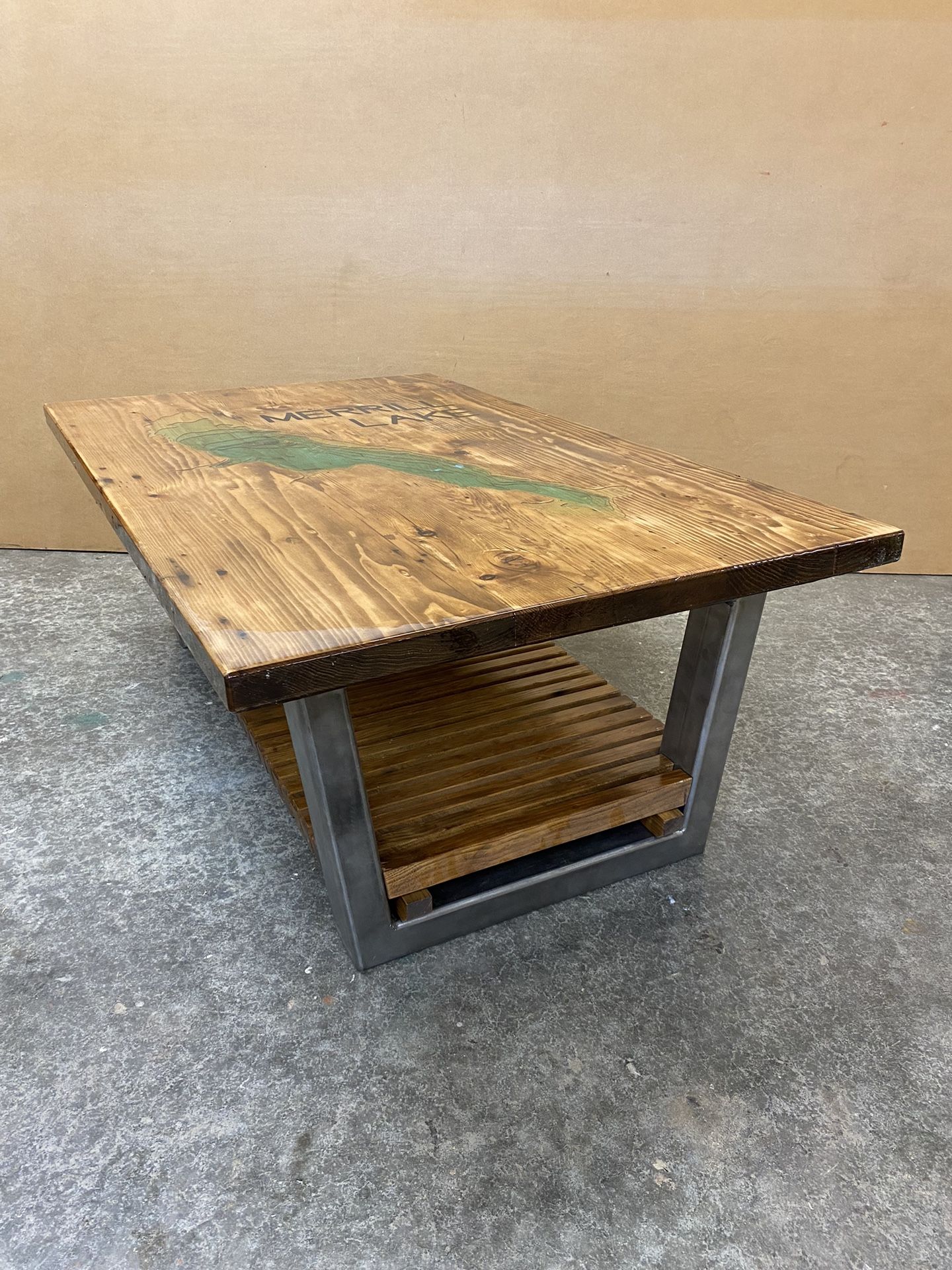 Topographic “Merrill Lake” epoxy table. Heavy duty steel base. 48” long 30” wide 17.5” tall