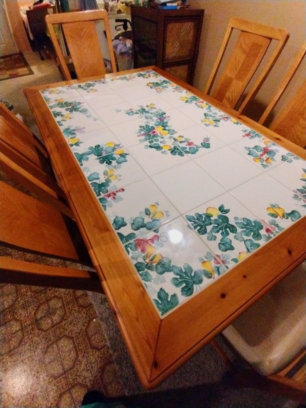 Italian Hand Painted Kitchen Table..Grape Vine [email protected] Wood And Tile Top..Size 62x38 Wide 30 Inches Tall...6 Padded Solid Wood Kitchen Chairs.