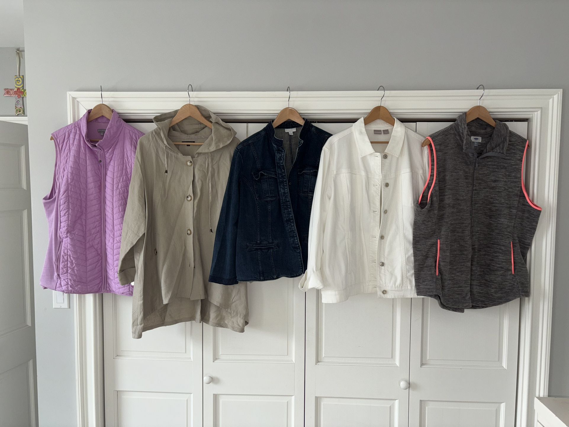 All are marked 2x Talbots quilted vest Linen parka Denim Jean jacket- charter club White denim - Chico’s Grey fleece - old navy Excellent condition