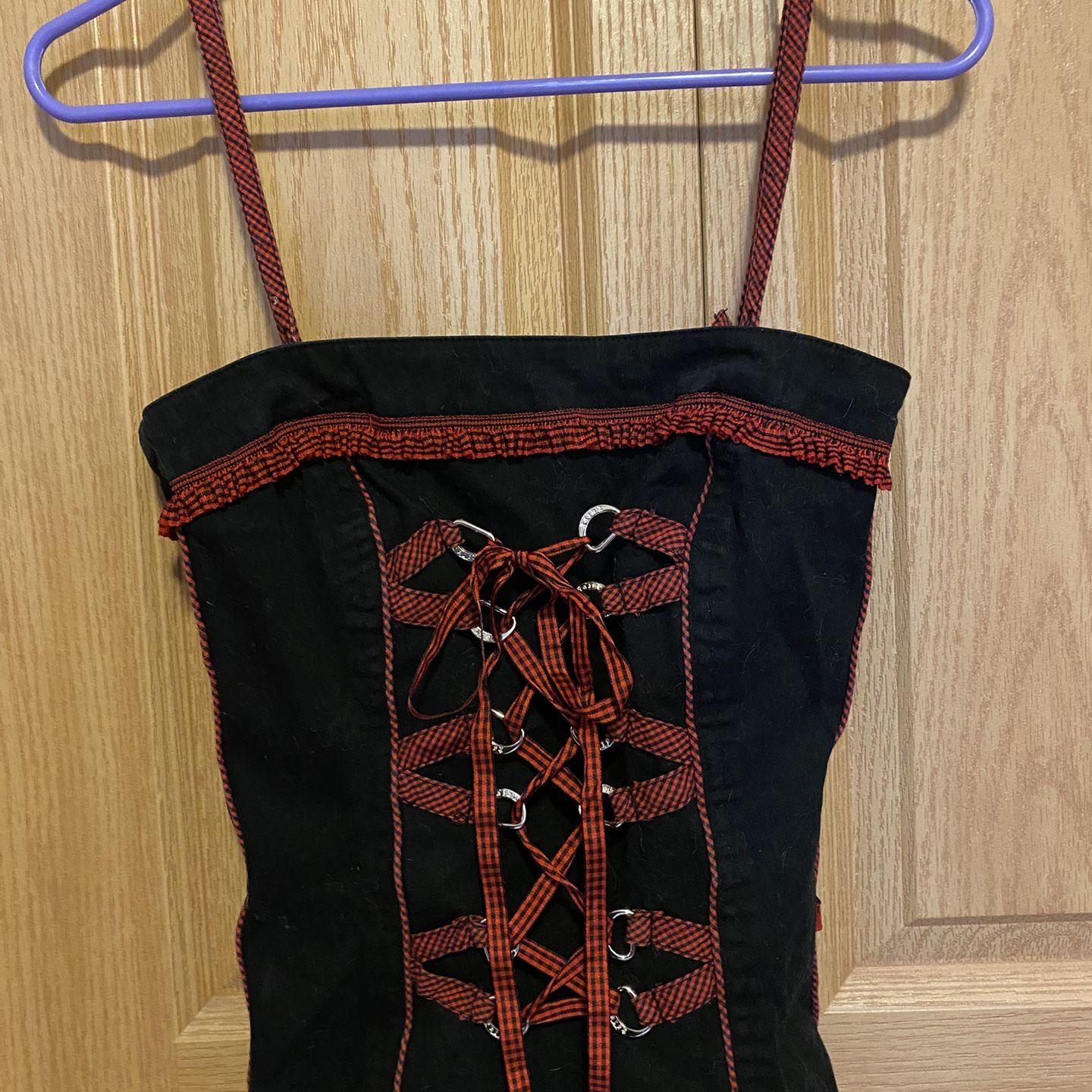 Rare Vtg Tripp NYC womens size Medium black corset top. This has adjustable spaghetti straps, plaid ruffle accents, corset tie lace up front, stays on the sides and a back zipper. - gothic emo scene punk grunge corset women’s clothes clothing top shirt girl girls lady ladies