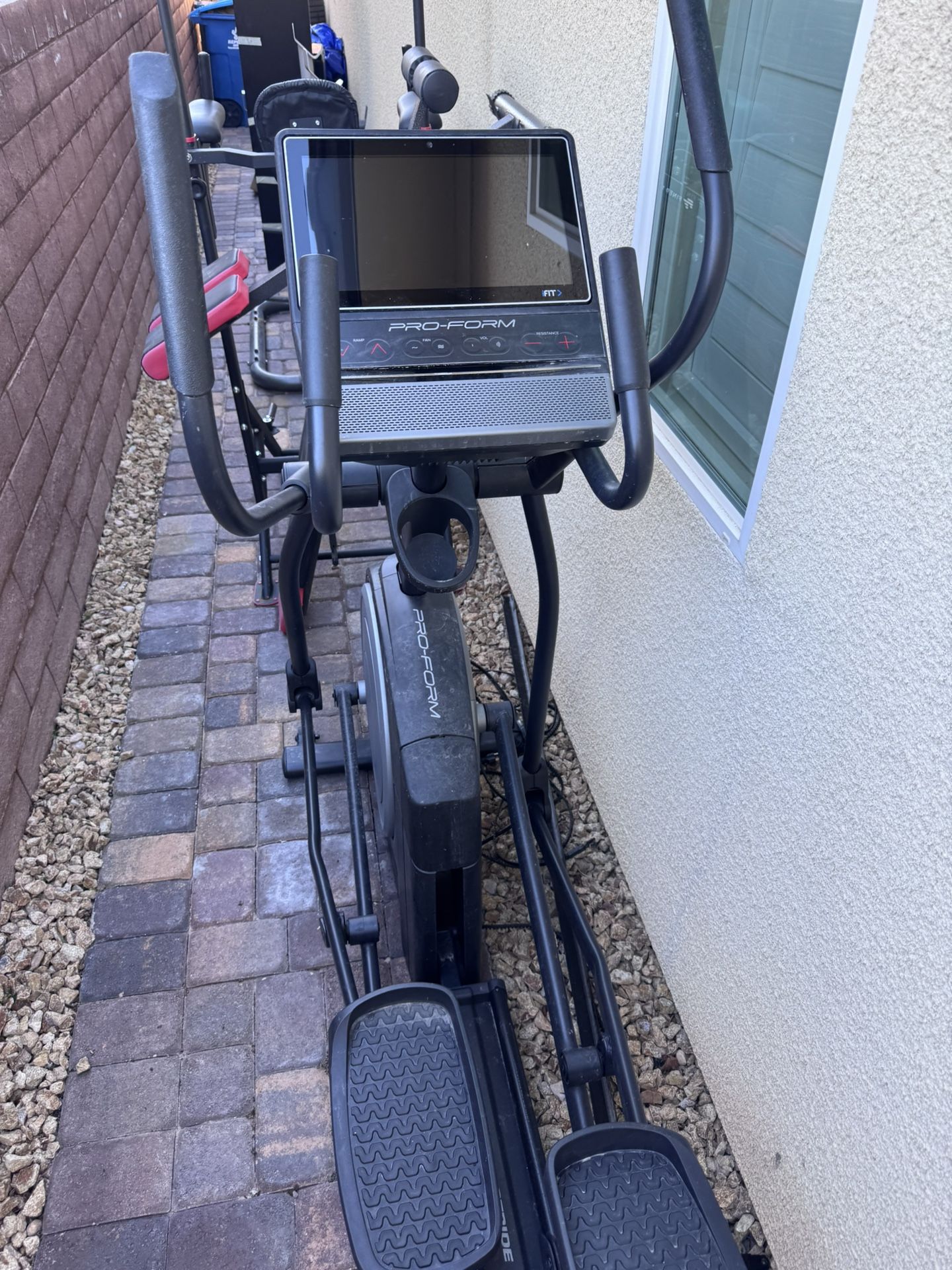 Adjustable weight bench with back extension-$40 Golds gym barbell squat rack and weight tree - $40 Pro form elitical - $100 All are in used but acceptable condition. Need some tlc after being outside for the past few weeks. Must pickup Located cactus & buffalo