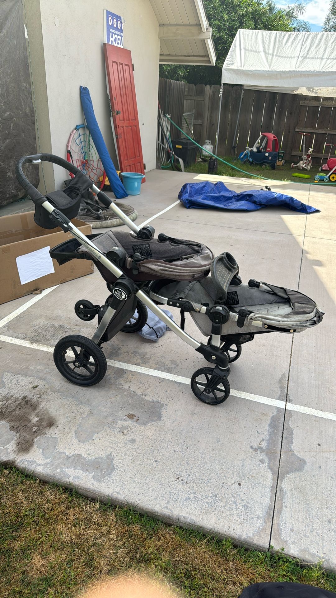 2 seats one feeding attachment and one standing attachment and a drink holder included. Dusty but in good shape.