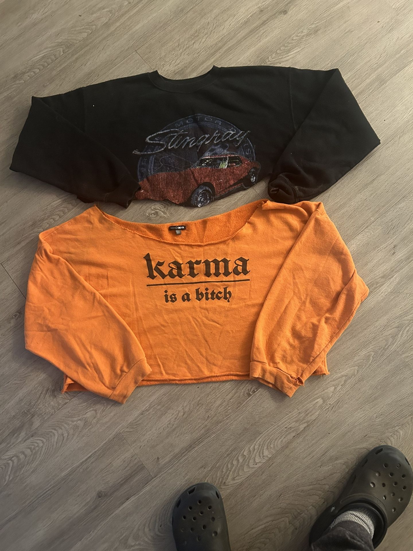 Fashion nova- Cute but not in the best shape. Orange has a tattered sleeve as picture. Black has what looks like a little bleach spray near wrist sleeve as well. Both sweaters $5 No tags for size but if I had to guess size - xl - xxl