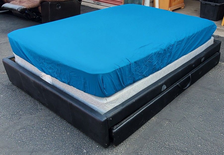 2 pc Queeen bed set. Undercarriage storeage with rollers. Minor scuffs on the side. Disassemble easily. Mattress not included.