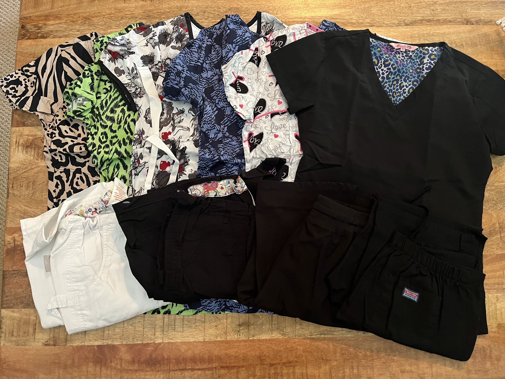 Tops: Tan/black: beyond scrubs, XS Green/black: beyond scrubs, S White/flowers: healing hands, XS Dark blue/light blue: landau, XS White/love: heart soul, S Black: Made stretch, S Bottoms: White: Kathy Peterson, XS Black: Kathy Peterson, XS Black: GT performance, S Black: Cherokee workwear, S
