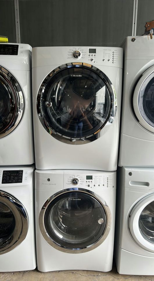 This gently used white Electrolux front load washer and dryer set is in excellent condition. It features a large capacity drum and is both energy-efficient and space-saving. The stackable design is perfect for smaller spaces. With features like SteamDry, SensorDry, and QuietDry, you'll enjoy a seamless and efficient laundry experience. The reversible door adds convenience, making it adaptable to any setup. Comes with 60-day warranty Same day delivery available DM / Message us for more info Hablamos español