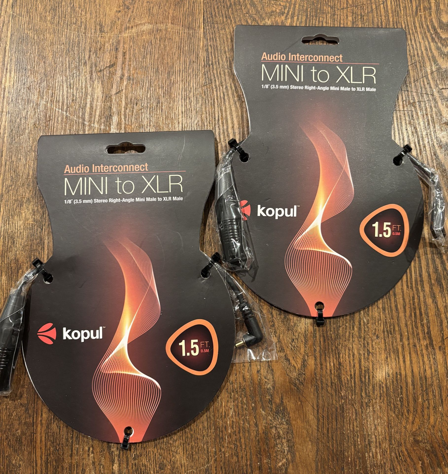 Kopul Stereo Right-Angle 1/8" Male Mini-Jack to XLR Male Cable (1.5') **2 available** From B&H website: The 1.5' Kopul Stereo Right-Angle 1/8" Male Mini-Jack to XLR Male Cable can connect the line output of devices such as a computer, camera, smartphone, wireless receiver, or MP3 player to the XLR input of a mixer, PA system, audio recorder, or camcorder. It merges both channels of the stereo output from your playback device into a mono signal for connection to an XLR input. This durable cable is engineered for protection against EMI, RFI, and static noise while maintaining flexibility. The cable features a gold-plated 1/8" (3.5mm) right-angle stereo mini-jack with molded strain relief, and an XLR connector with chuck-style strain relief made by Rean. The 24-gauge OFC conductor, copper spiral shielding, and PE insulation result in a quiet cable with improved conductivity, assuring pure transfer of audio signals.