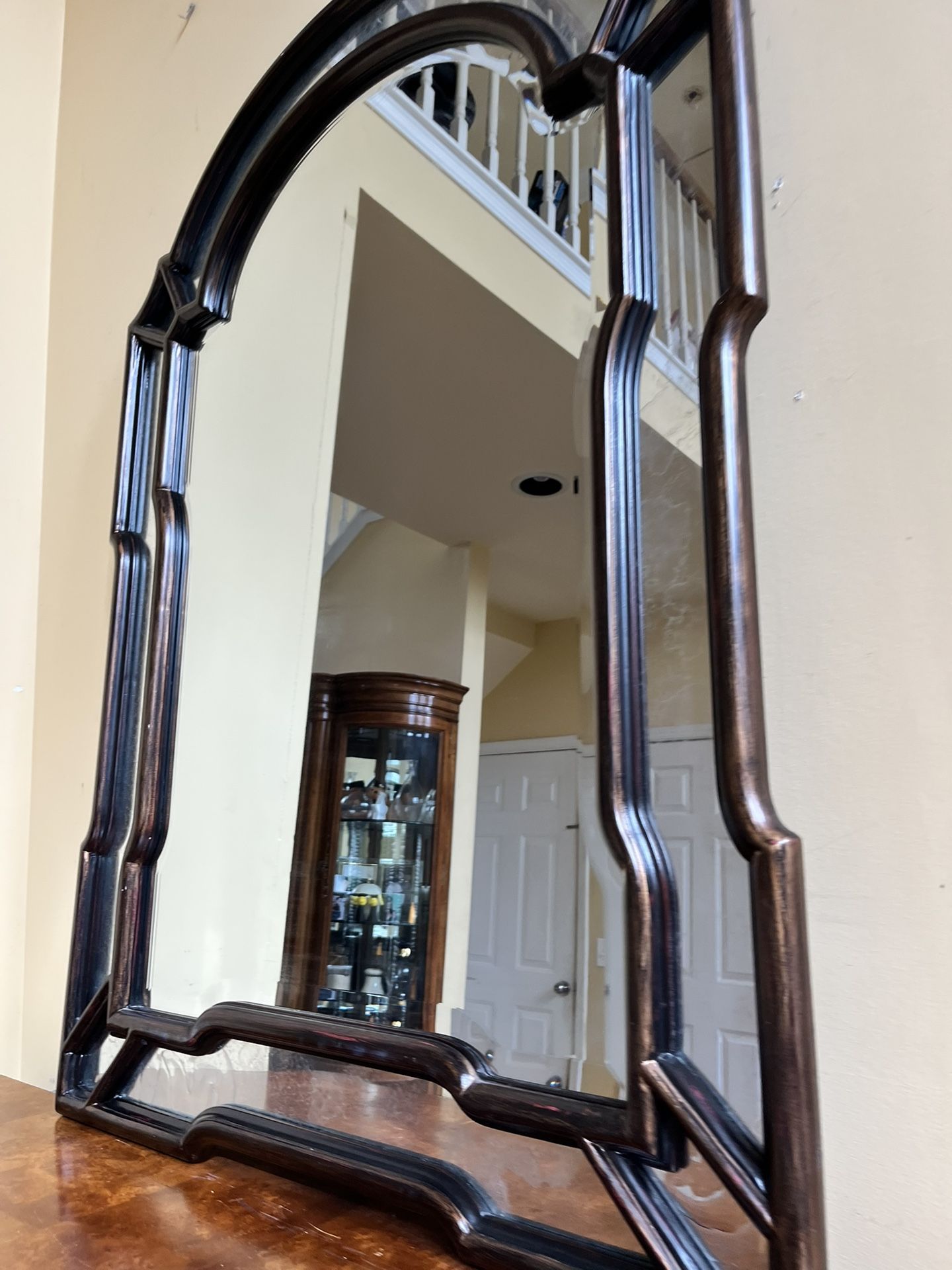 Large statement wall mirror with a rich dark wood frame and layered beveled glass panels surrounding the center mirror. Beautiful architectural shape with an arched top very high-end look. Comparable Statement mirrors retail significantly higher. • Solid wood frame • Secondary beveled glass border (adds depth + reflection) • Heavy, substantial piece • Works great in a foyer, entryway, living room, or above a console Condition: Like new, with minor cosmetic wear consistent with age. Glass is clean and intact. Urgent home renovations sale. Local pickup only (heavy item). $475 or best reasonable offer.