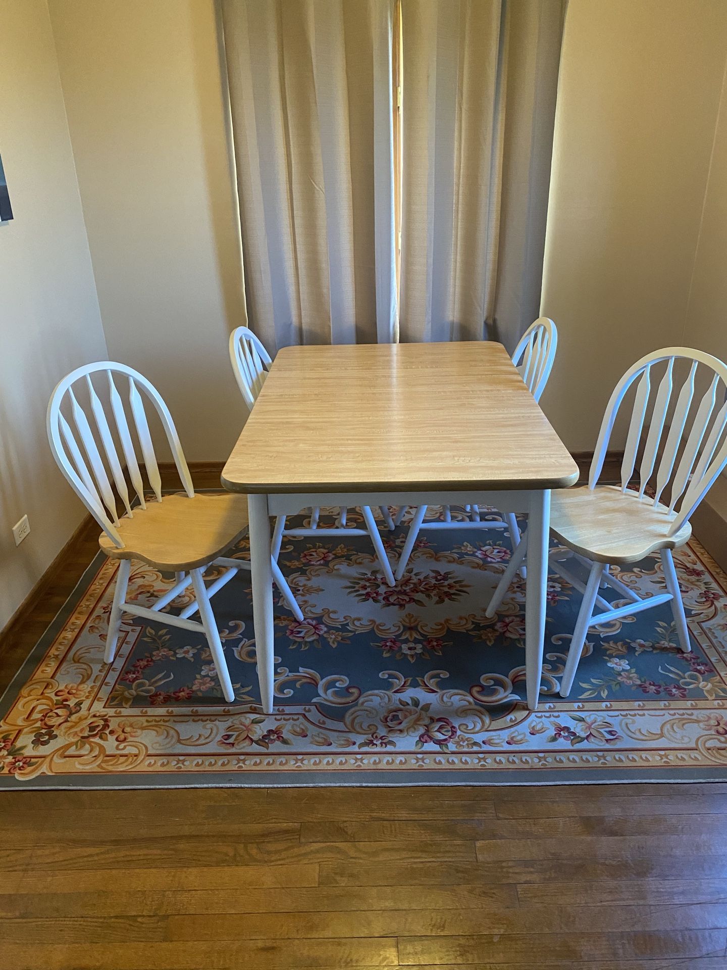 On kitchen table and four chairs Table top measurement is 3 x 3 without the leaf. And 4 foot 6 x 3‘ with the leaf
