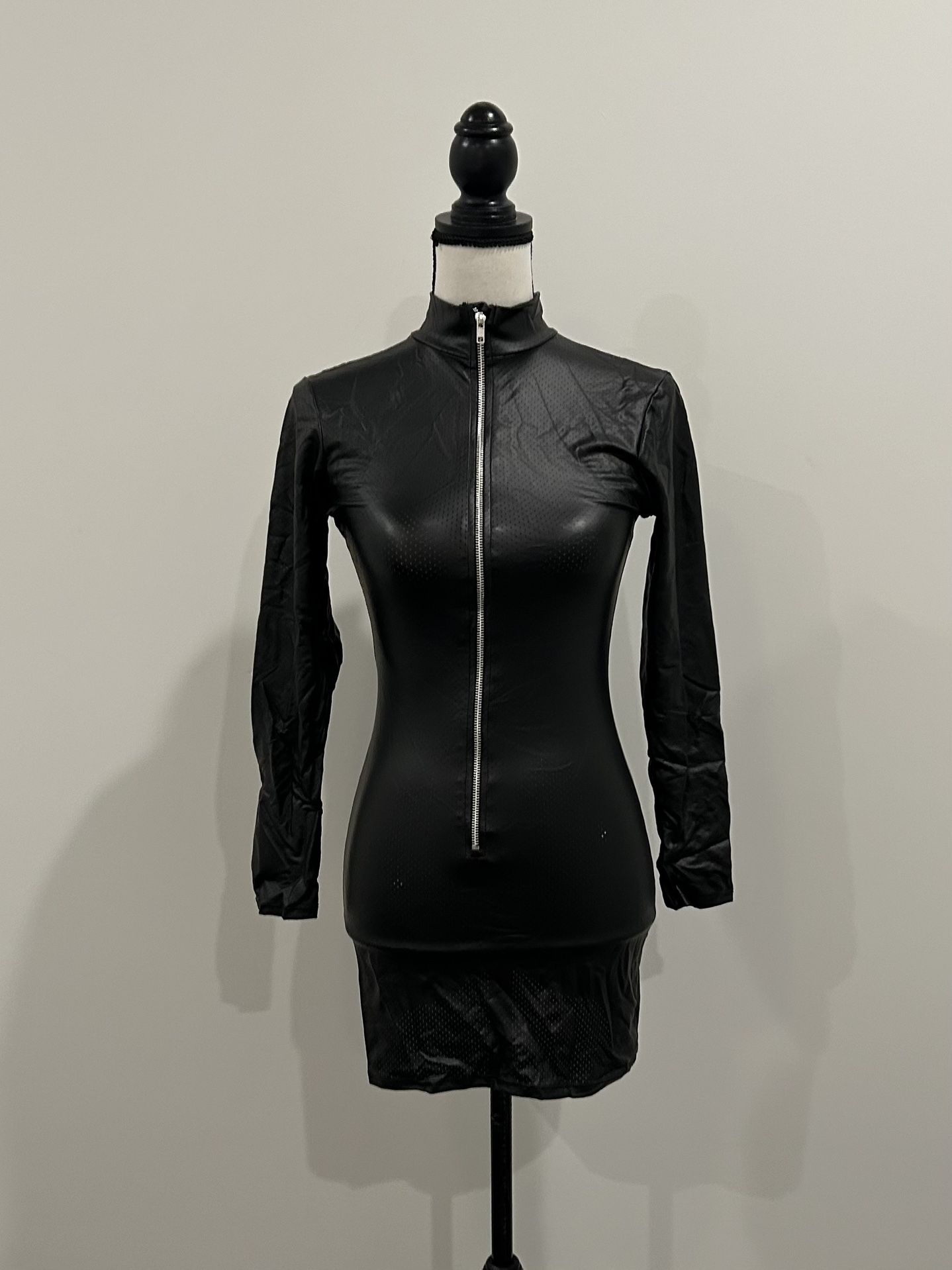 Fredericks’s of Hollywood Lexie Chemise dress- black. Bodycon. Zips up the front. Mock neck. Long sleeves. Perforated. Stretches. Size M. New! Approximate Measurements: Pit to pit - 15” Shoulder to hem - 28” Polyester | Spandex 16