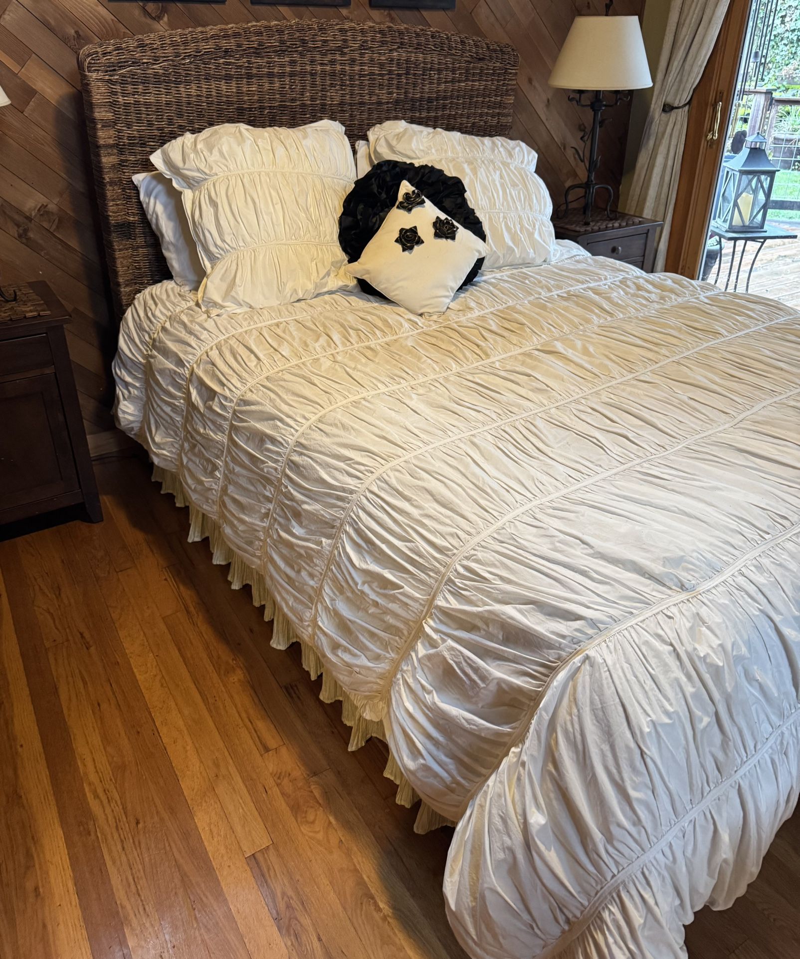 Queen wicker headboard and frame. Barely used in a guest room, in great condition.