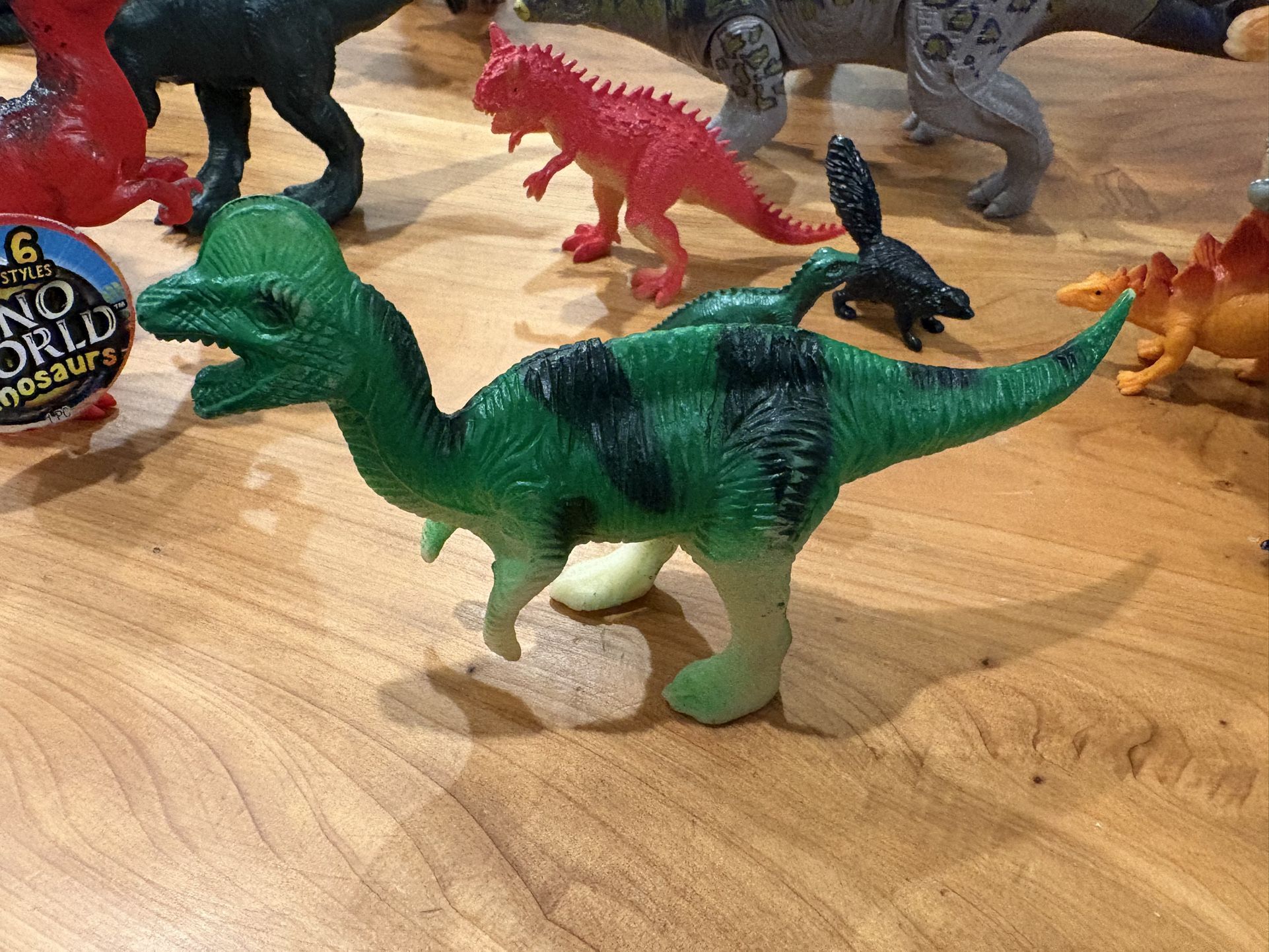 14 dinosaurs figures. T-Rex (brown) T-Rex (darker brown/olive tone) Triceratops (brown, yellow horns) Triceratops (blue-brown blend) Spinosaurus (green) Spinosaurus (red-orange) Raptor (green) Raptor (dark grey) Stegosaurus (tan/orange) Stegosaurus (light brown) Ankylosaurus (dark green) Pteranodon (red) Pteranodon (green) Tiny dino (green)