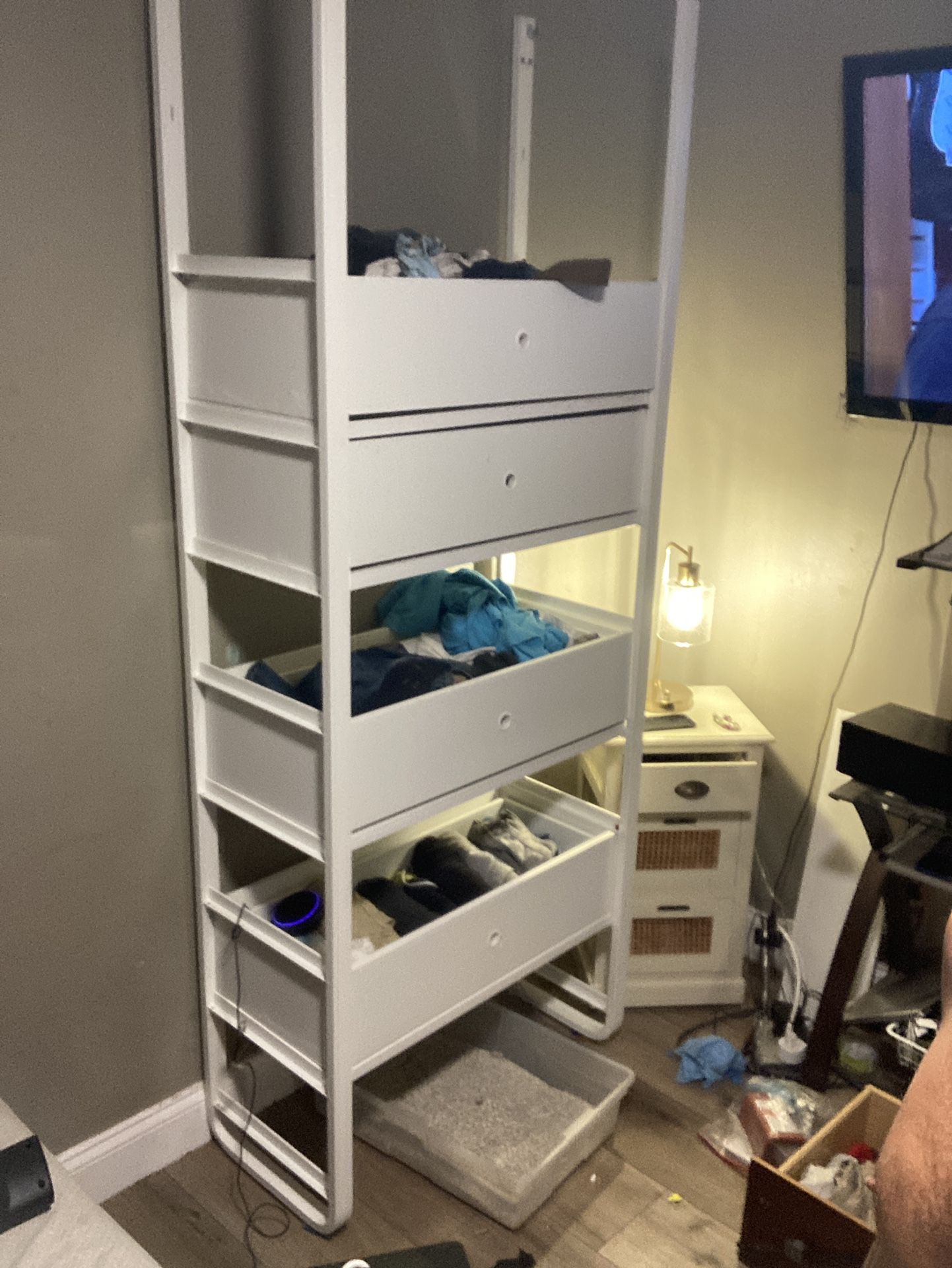 The configuration i set was with the section I had out of the three with all hooks and rails included. However I don’t have the original shelves or other pieces for the missing spots You could simply cut a piece of wood snd paint it and fit it in whichever new configuration you desired or add rails for banging clothes etc. 33” Wide by 15” deep Comes with all sides rails and hooks for desired spacing of shelves (which I don’t have) or the four drawers in whichever height you choose)this was one of three side by sides in the wardrobe collection however it can be used as i!!