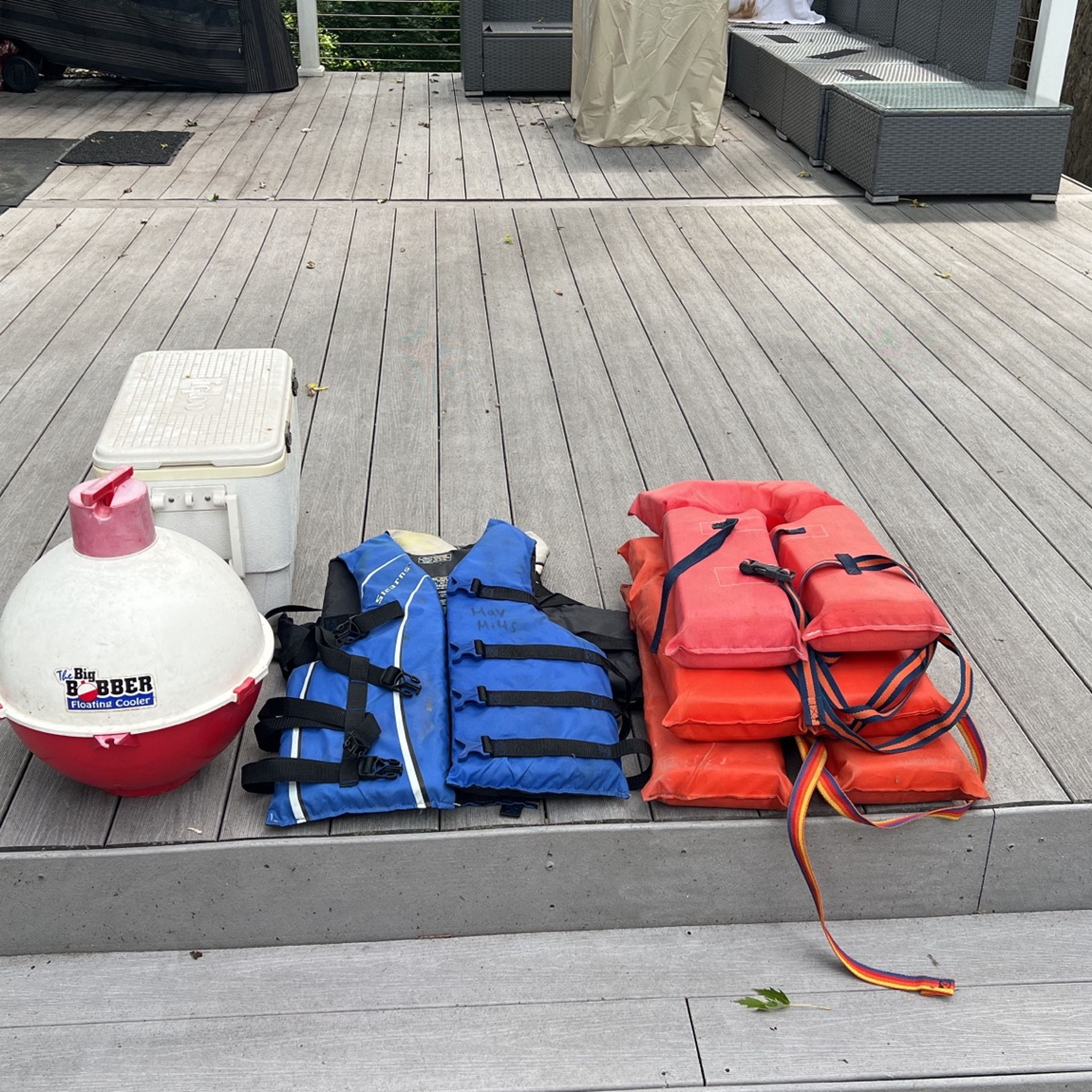 3 standard orange life jackets, 2 ski jackets, bobber cooler and regular cooler. Available altogether for $75 or can be sold separately for $10/item with exception for the ski jackets which are $15/each. In addition other cooler sizes and styles available. With or without wheels. Boating season only has about 2 months left at best so if ya need some accessories for cheap here ya go
