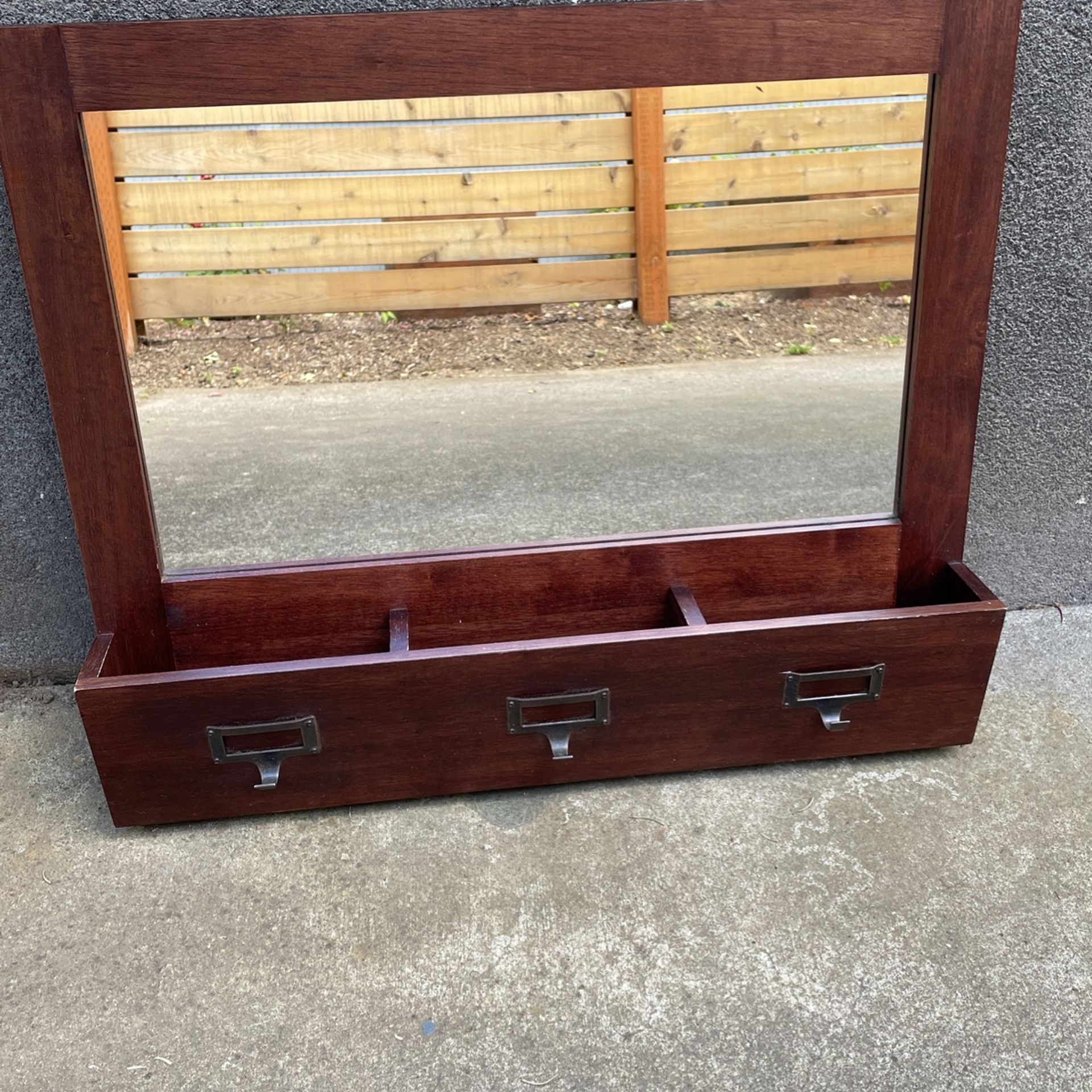 23” wide x 19” tall x 3.5” deep. Great piece for entryway. Hooks for keys, cubby’s for mail, and wood framed mirror. Great front entry piece.