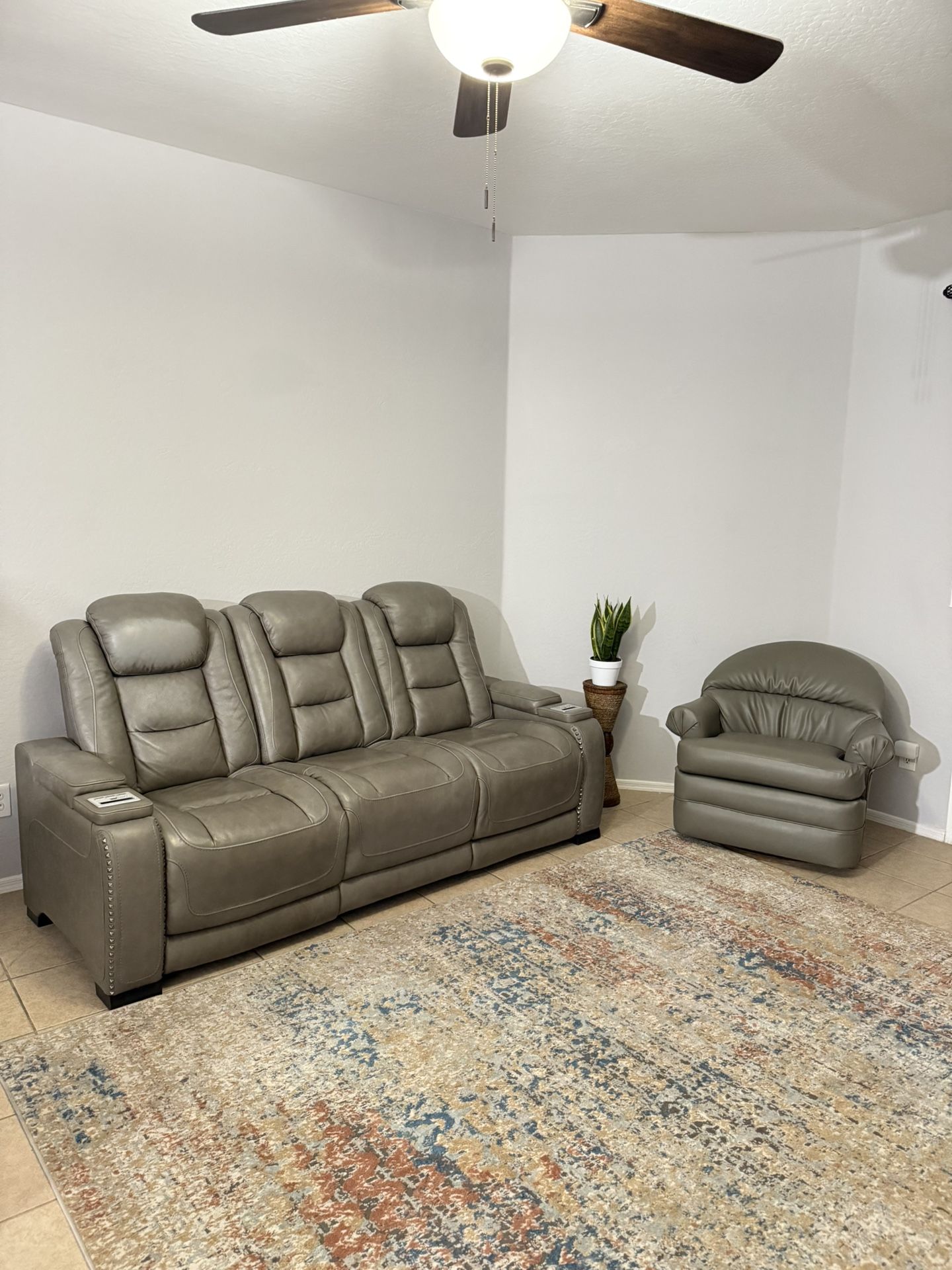leather recliner plus leather chair included. Has usb ports for phone charging. Middle seat folds down into a table and has lamp. Please see all pics for condition of couch, has fading on one of the seats but overall in great shape. Must pick up off 67th Ave & southern.