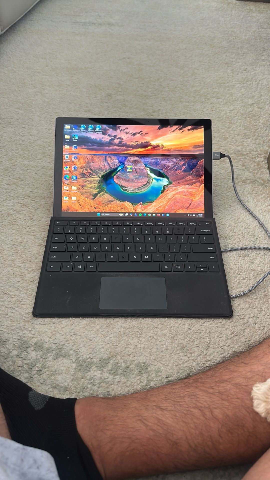 -i5 processor -128gb SSD -8GB RAM -touchscreen tablet with accompanying magnetic keyboard -charger included - functions well, slow compared to new models just don’t ever use it anymore