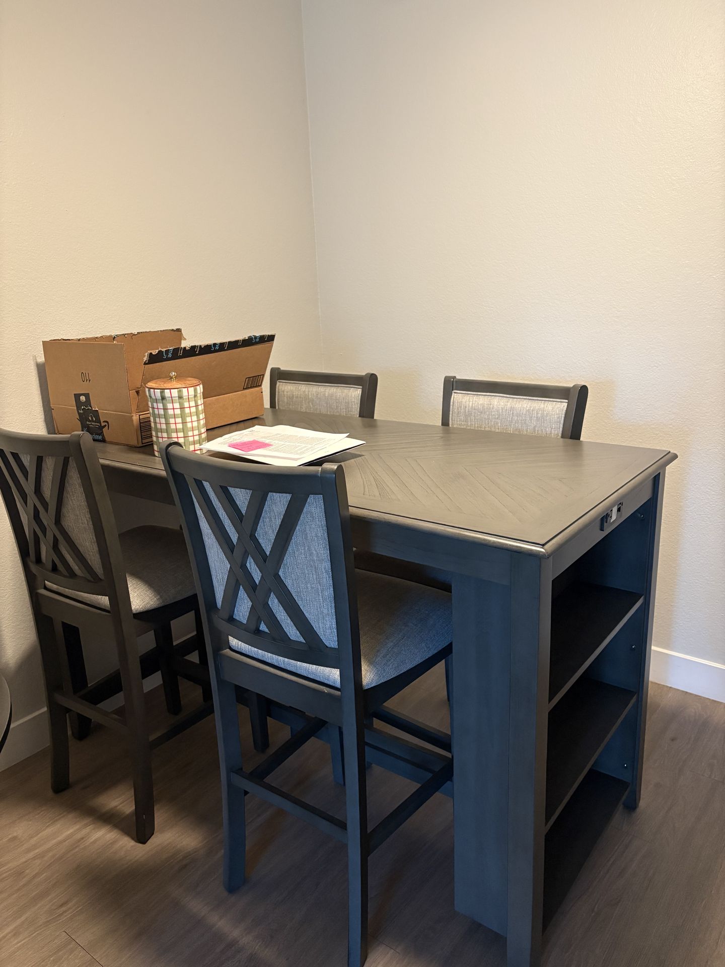 Selling grey dinning table and 4 chairs included. New condition, no scratches. Pick-up only please.