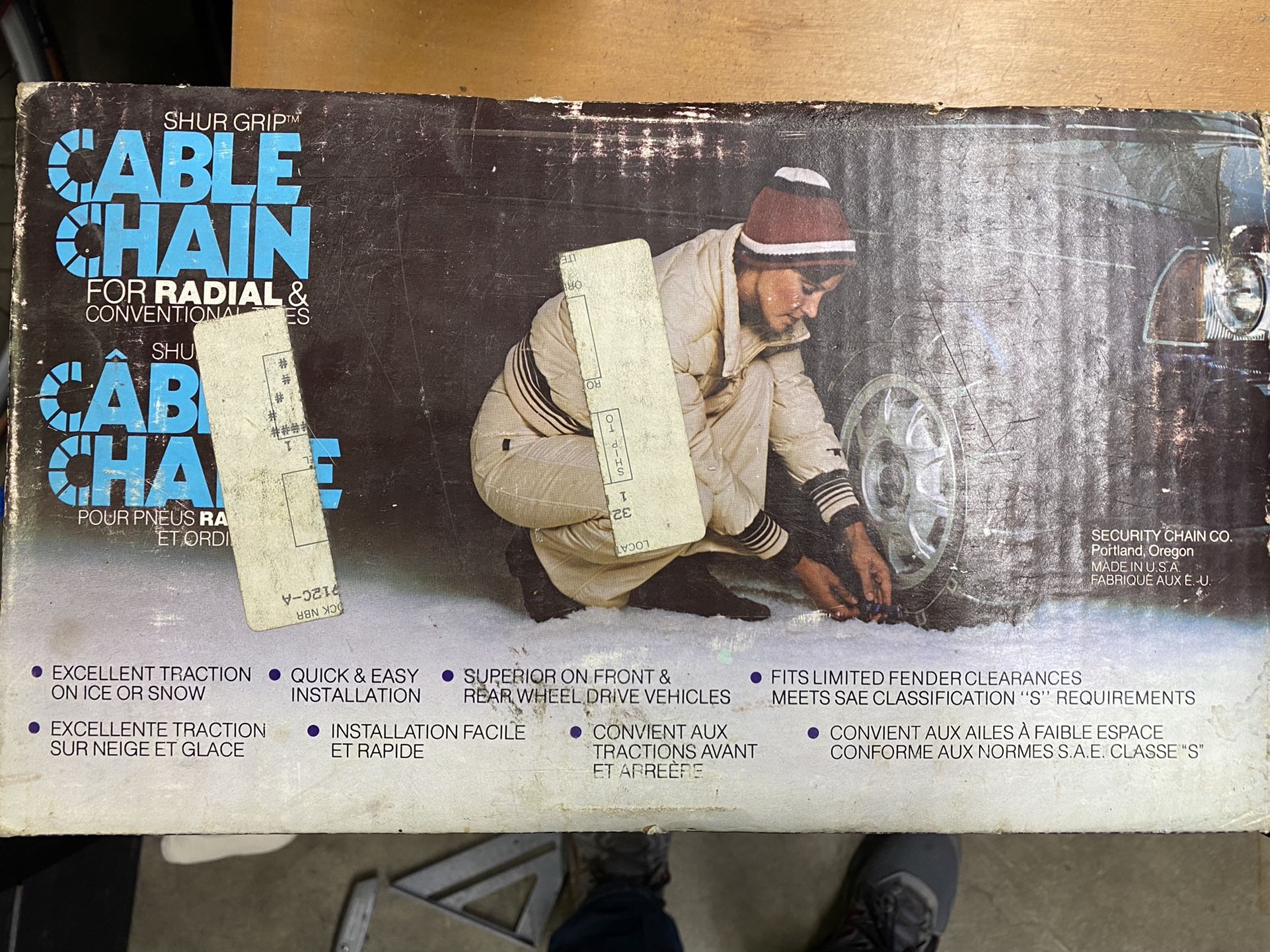 Snow Cable Chains for Passenger Car. Older model but never used. Made in the USA. Image shows tire size that fits but probably also fits other newer lower profile tire sizes.
