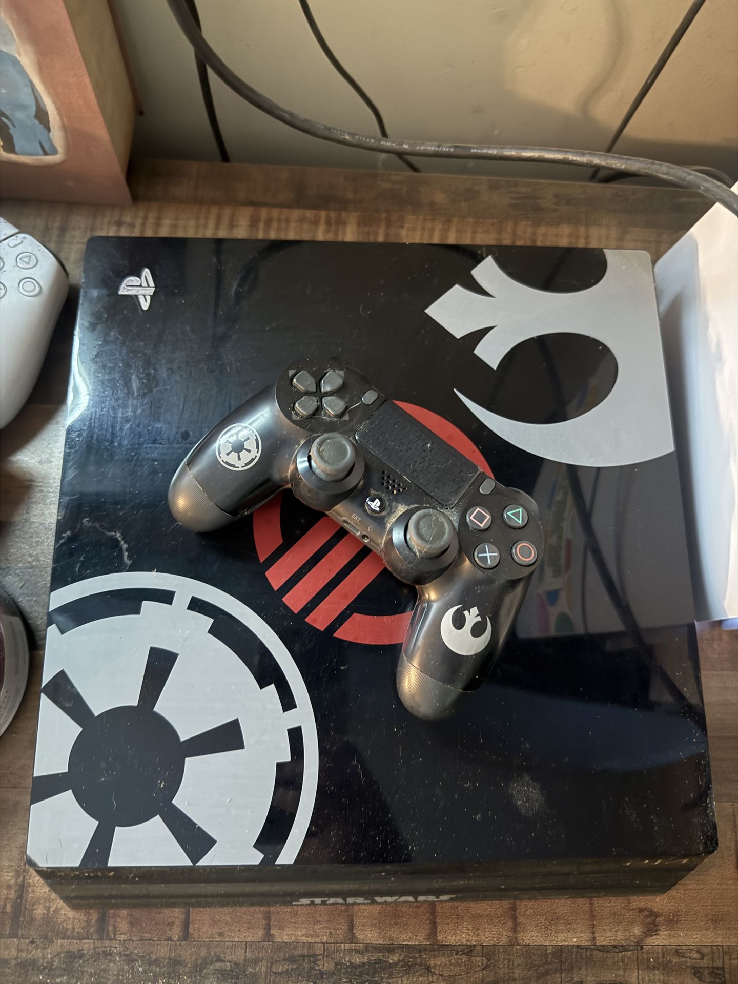 Star Wars battlefront ps4, will come with 2 controllers and cables for it to connect to tv and power. Nothing wrong with it just don’t use it anymore