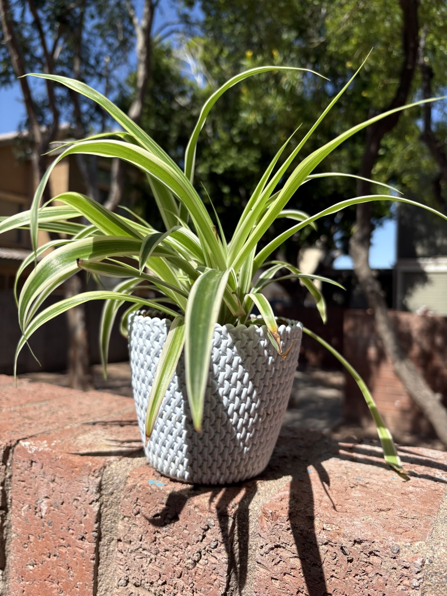 Spider plant with cute white plastic pot. Great indoor plant that loves indirect light.