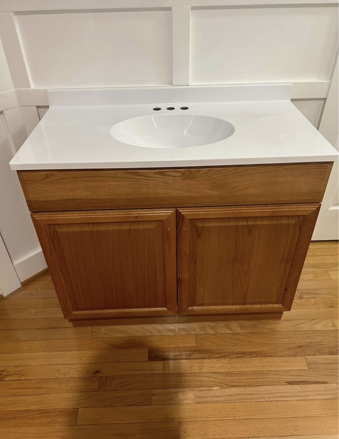 brand new 36"w x 18"x 33"h bathroom vanity with white cultured marble top for 4" spread faucet. Solid oak square raised panel doors and face with particle board box. Pick up in Severn, cash only
