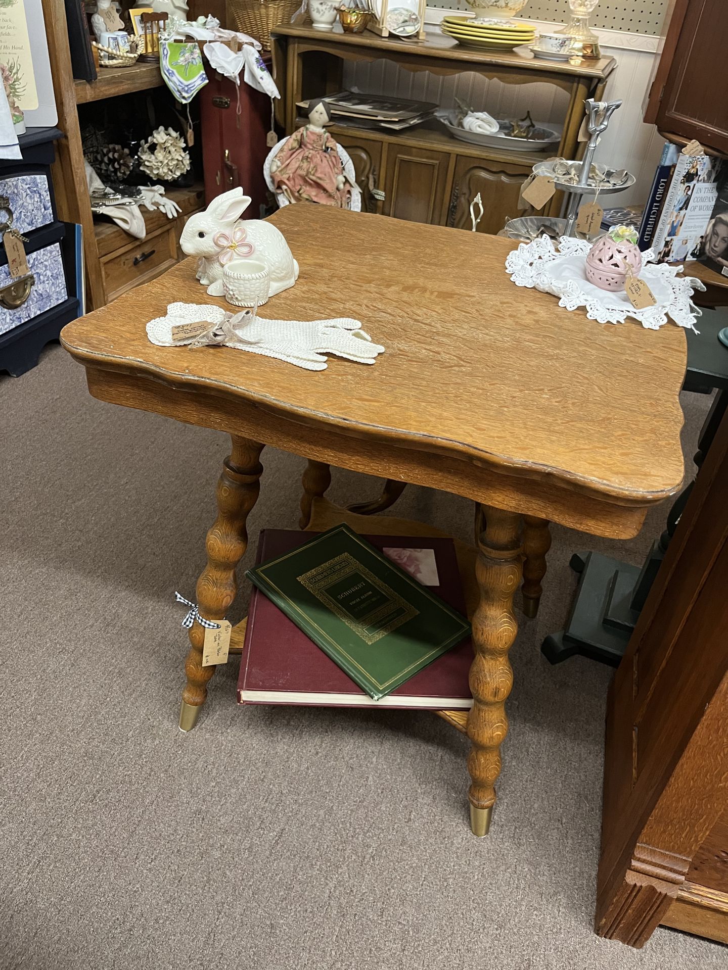 Antique end side table. This can be found in booth B16. See photos for location and other info. Measures about: 23.5” wide, 23.5” deep, and 25.5” tall