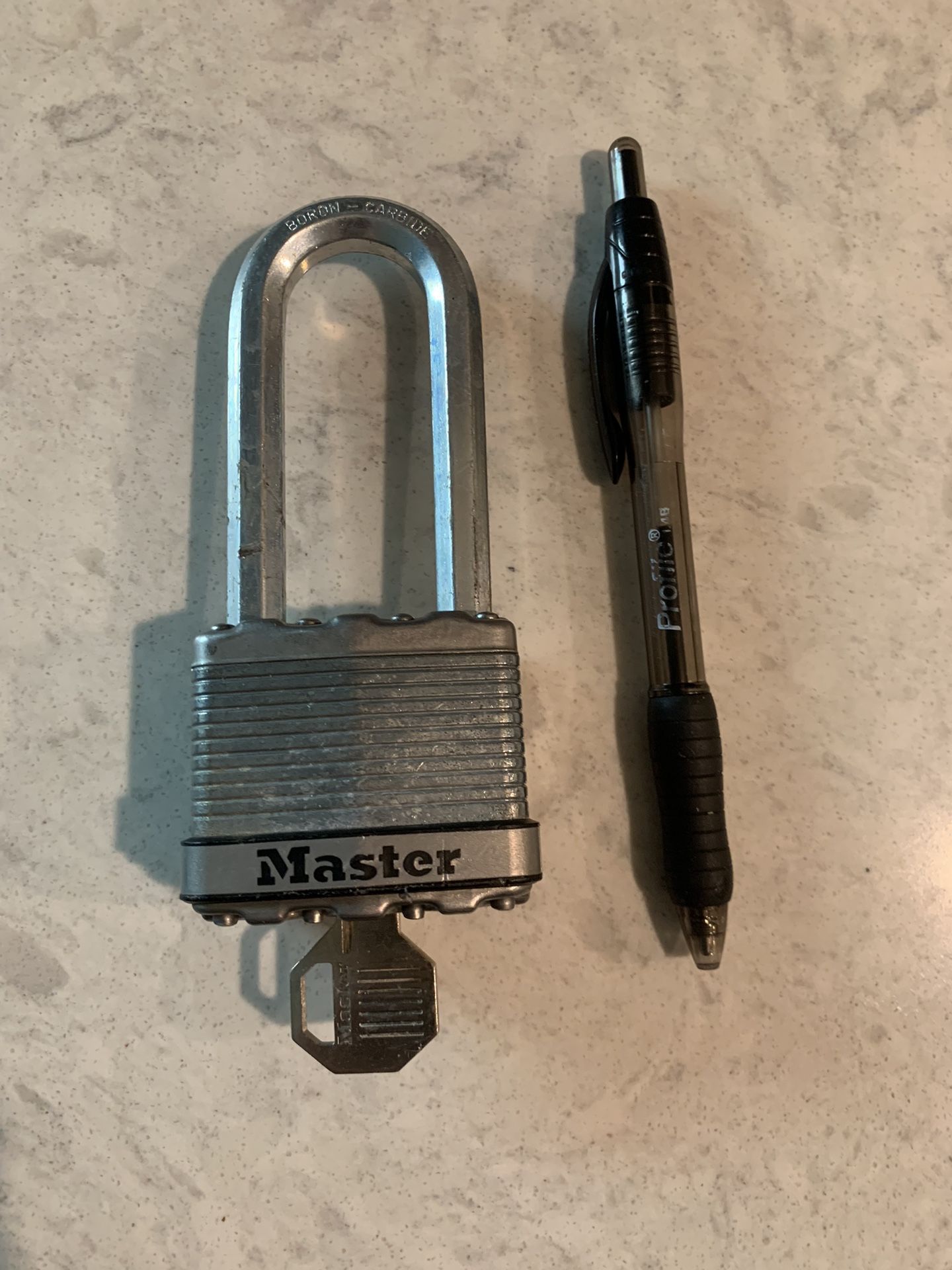Heavy duty. 2.5 inch space to lock (we used it on a hitch). 4.5” total height. One key $12