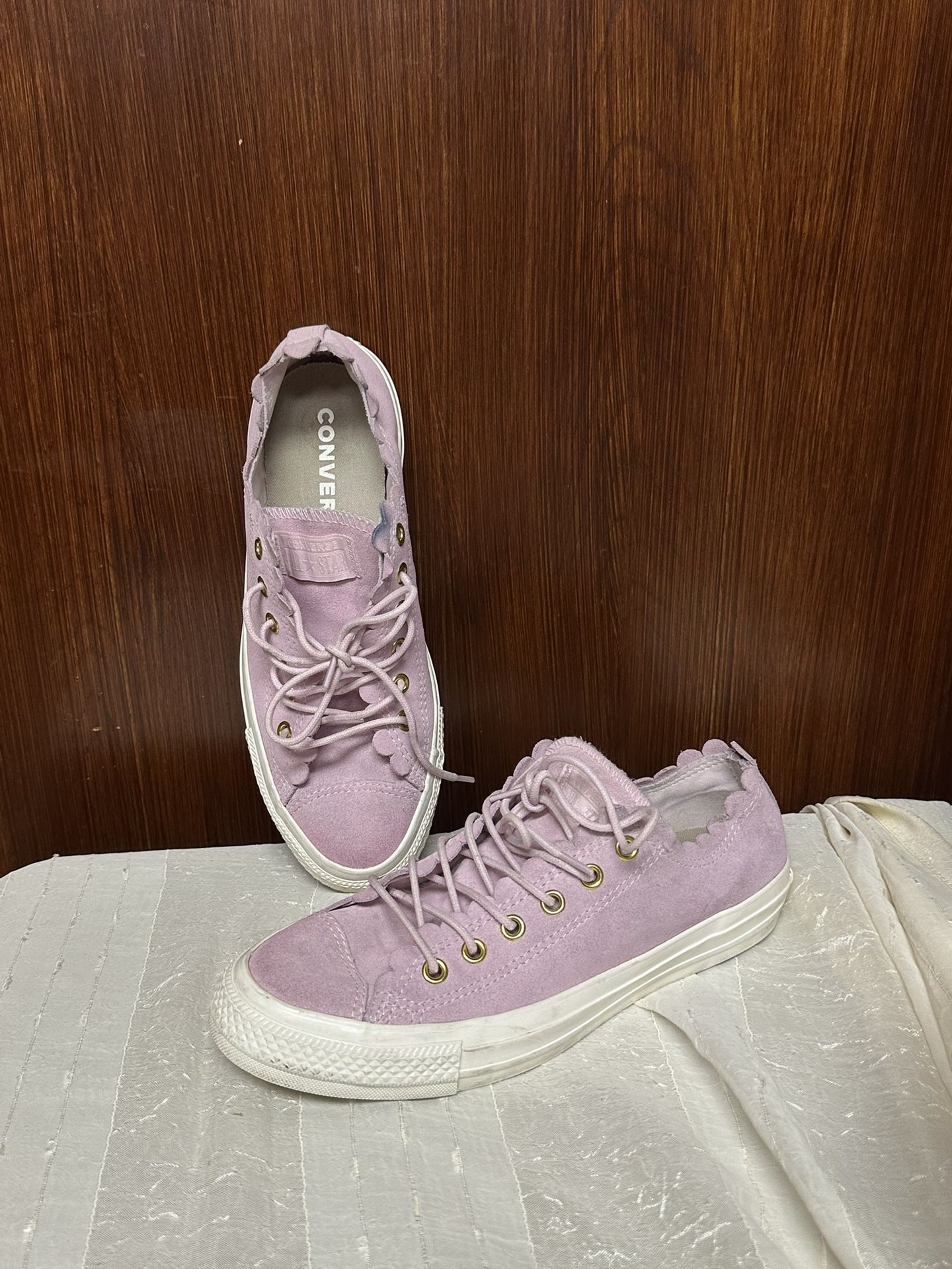 Converse pink scalloped Chuck Taylor All Star Women's size 7.5 Frilly Thrills Pink GENDER: WOMEN UPPER LEATHER LINING: TEXTILE OUTSOLE: RUBBER MADE IN INDONESIA Preowned, slight sign of used, they’re clean inside of them , still look good