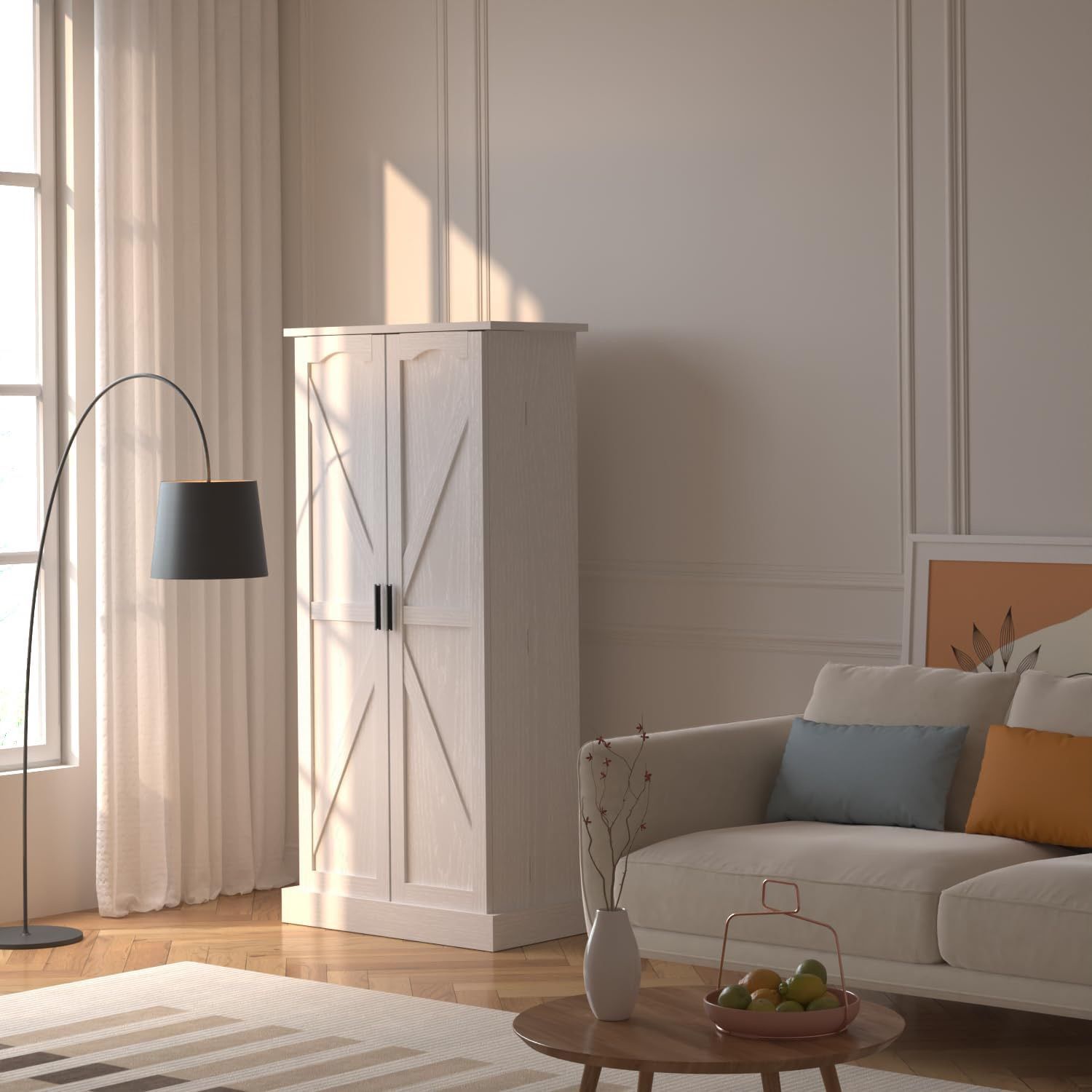 New in box, need to assemble, any car will fit, LBS02 About this item 【Versatile Farmhouse Style】 GEPELCN Kitchen Storage Cabinet with two classic barn doors in an elegant and stylish wood grain finish with black metal knobs subtly blends modern aesthetics with vintage farmhouse, matching perfectly with any of your furnishings and decor. 【Intelligent LED Light】 GEPELCN pantry is equipped with an intelligent LED light that comes on immediately when the door is opened and goes off when the door is closed, with a battery life of up to 180 days. 【High-quality Engineered Wood】Made of P2 MDF, it can hold up to 150 pounds, is sturdy and durable, and comes with an anti-tip kit, please secure it to the wall for added stability. 【Adjustable Size Space】 GEPELCN storage cabinets have adjustable shelves that allow you to store items of all sizes in your kitchen cabinet organizer. You can also remove shelves to create additional spacious storage. 【Easy Assembly】Our instruction manual has detailed installation steps, in which all accessories and parts are labeled instructions, you can easily complete the assembly.If you encounter any problems, please contact the GEPELCN service team. The wood is FSC certified.