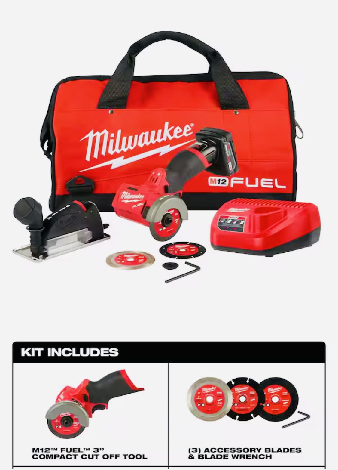 The M12 FUEL Brushless Cordless 3 in. Compact Cut Off Tool delivers multi-material cutting capability in an ergonomic package, optimized for 1-handed use. Spinning at 20,000 RPM and featuring a POWERSTATE Brushless Motor, the 2522 delivers fast and accurate cutting performance in a wide range of materials. The unique reversible blade rotation feature provides users ultimate control over material removal, along with the ability to select their desired blade rotation for the direction they need to cut. For ultimate cutting versatility, the 2522 ships with 3 accessories: a metal cut off wheel, a diamond tile blade and a carbide abrasive blade. The M12 FUEL 3 in. Compact Cut Off Tool also includes a tool free accessory guard and shoe that includes a vacuum adapter for dust mitigation as well as cut depth adjustment. Lastly, the tool also features tool free guard adjustment and an LED light.
