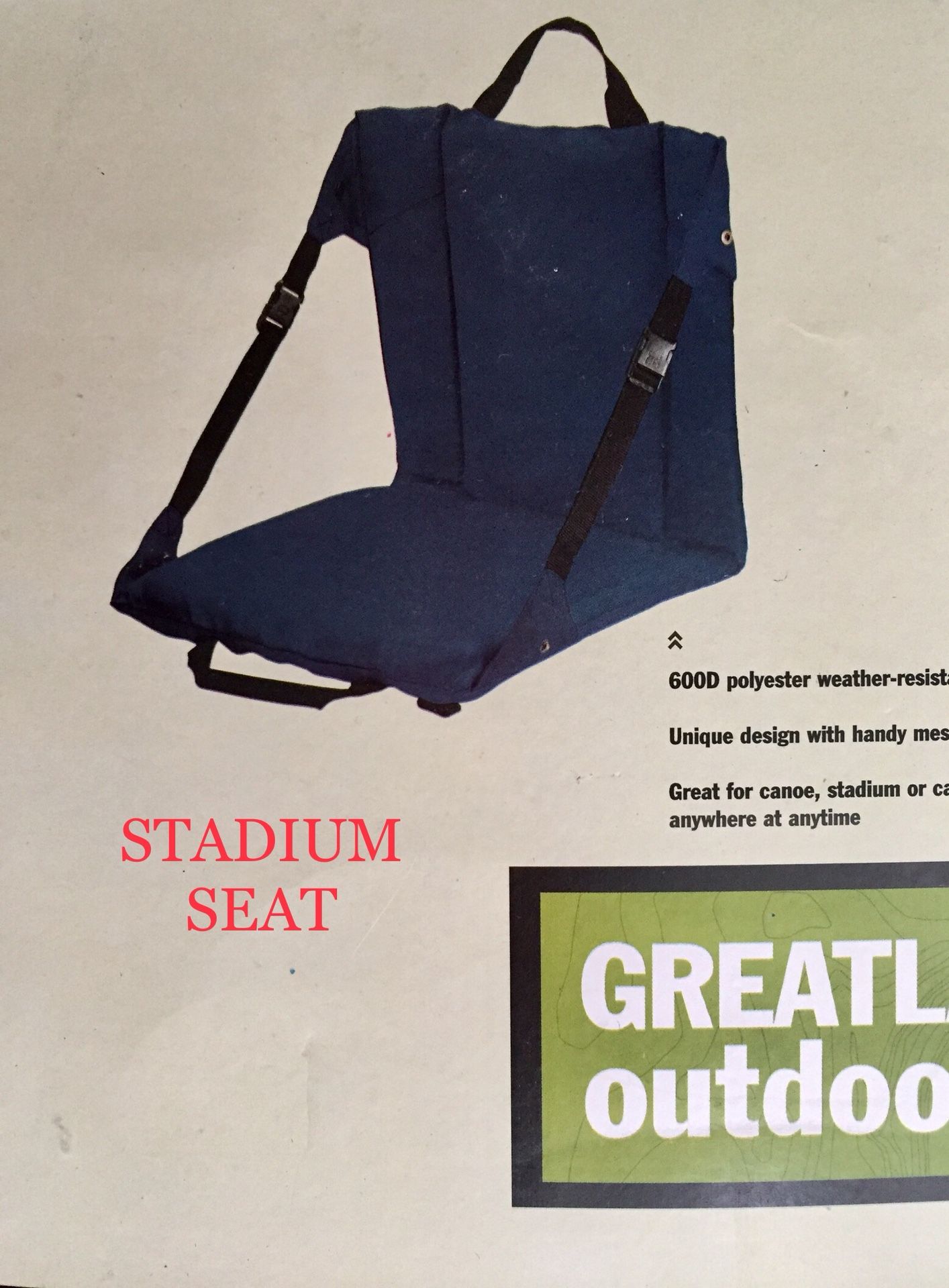 “Greatland outdoors“ stadium seat , great for school stadiums. FEATURES: • cushioned seat • back mesh pouch for storage • adjustable side buckles for back support • carrying straps for easy opening and closing • water resistant fabric • weight capacity: 250 lbs. Now you may sit comfortably with this seat.