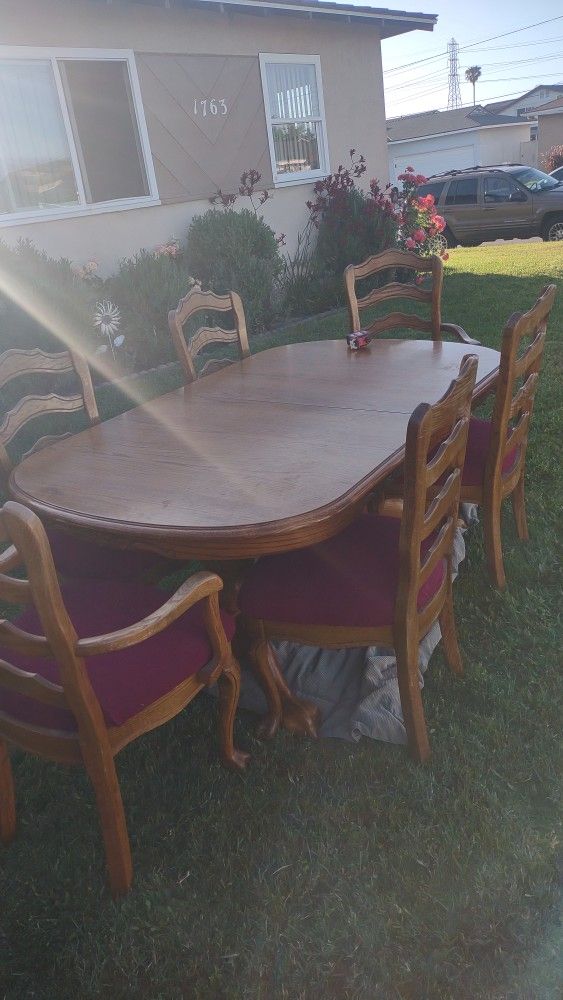 **MUST GO NOW** Extension is built into table. Has six chairs, 2 arm chairs, one needs an arm reached, easy. Red set covers over a blue cover. Approximately 90" extended and 70" not extended and 40" wide.