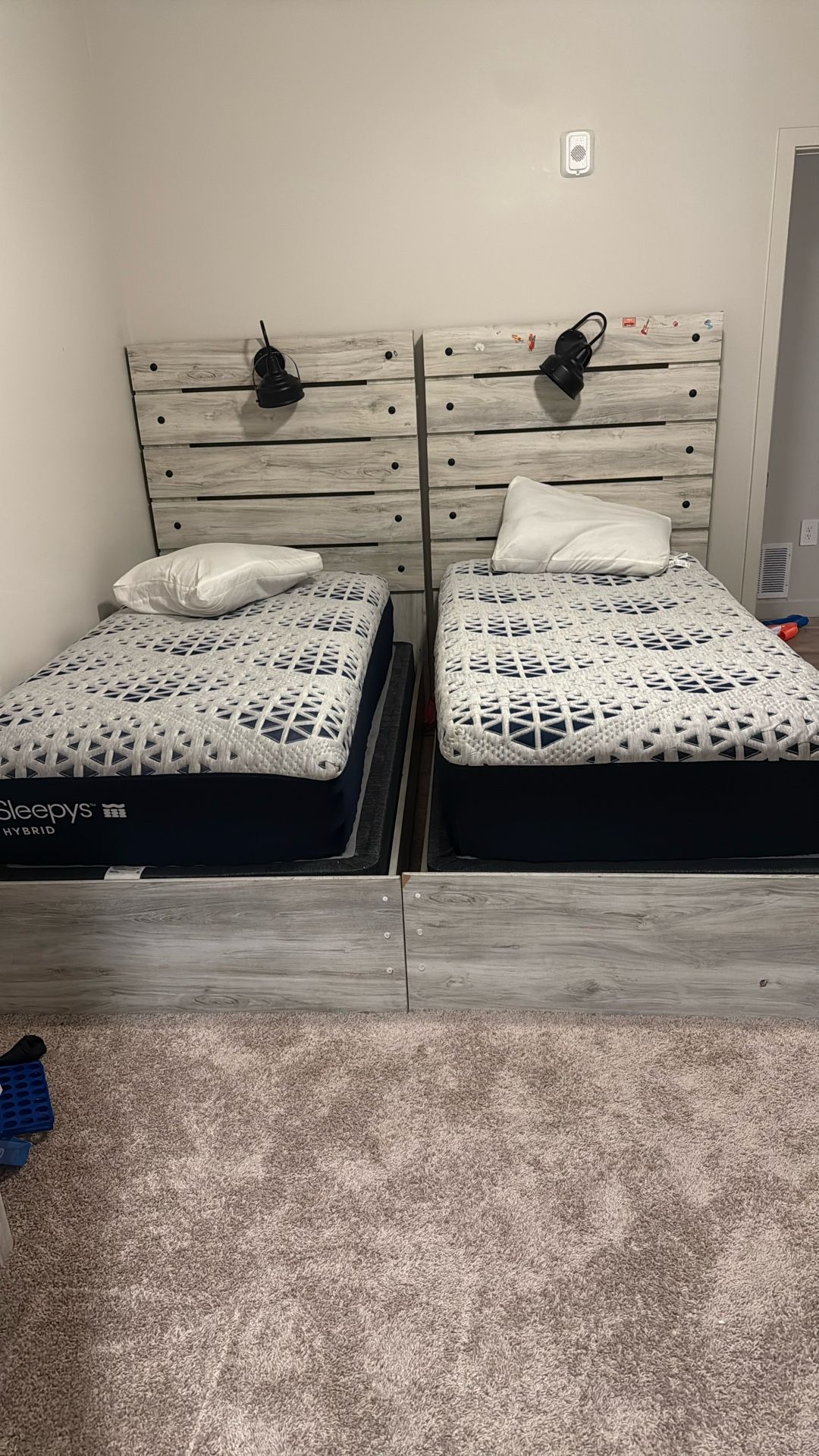 One mattress does have a few spots from chocolate. The cover can be removed and washed 2 dressers with it Tall dresser has 2 drawers off the track