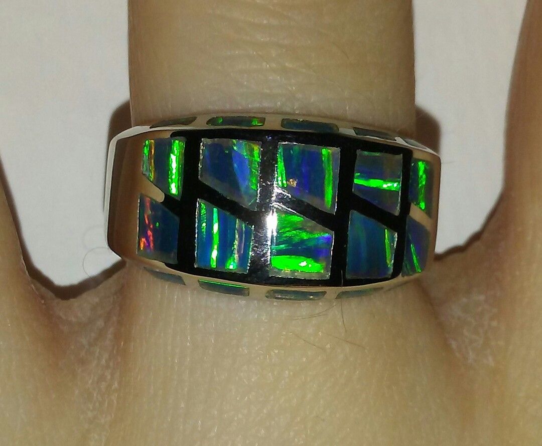 Up for sale is this beautiful new stamped 925 solid sterling silver band style ring SIZE 5 with gorgeous colors of fire Opal inlay set into the band in shades of aqua blue and green. This ring is stunning in the natural lighting! From our smoke-free home.