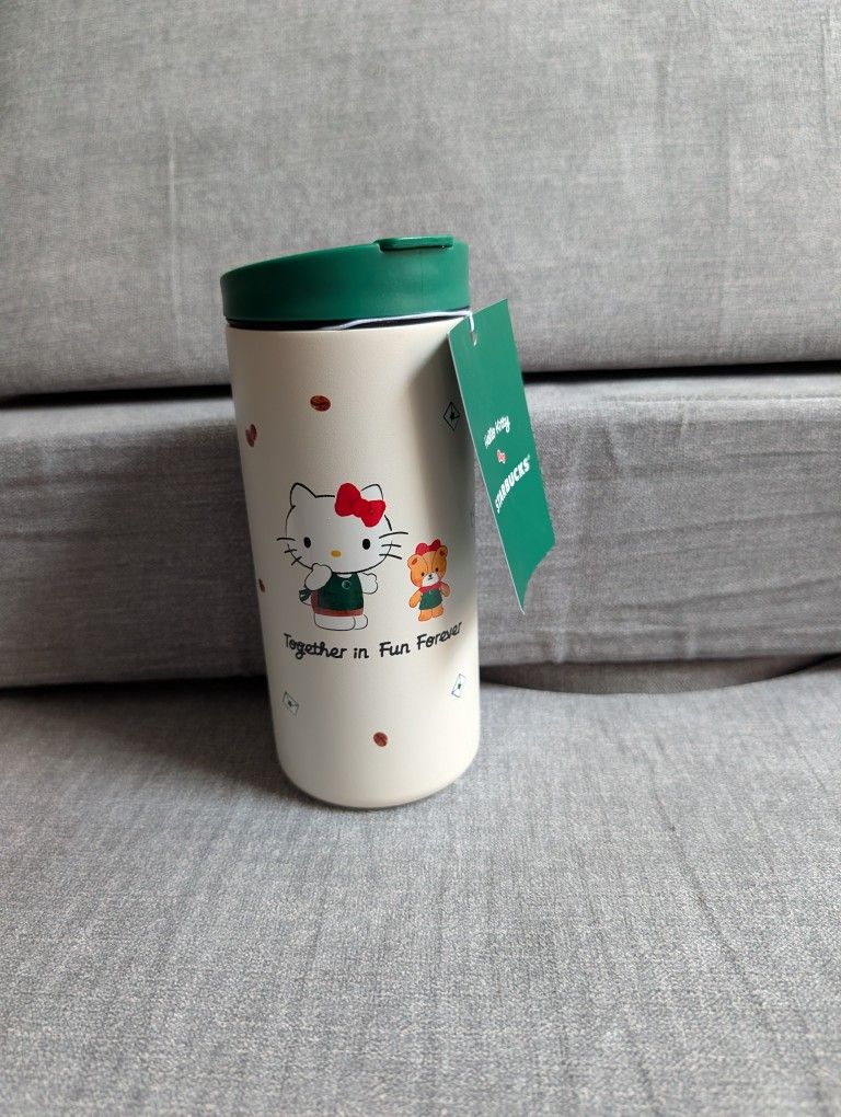 The 12-ounce stainless steel tumbler with Hello Kitty and Tiny Chum is a perfect companion for both hot and cold beverages, topped with a lid in Starbucks green.