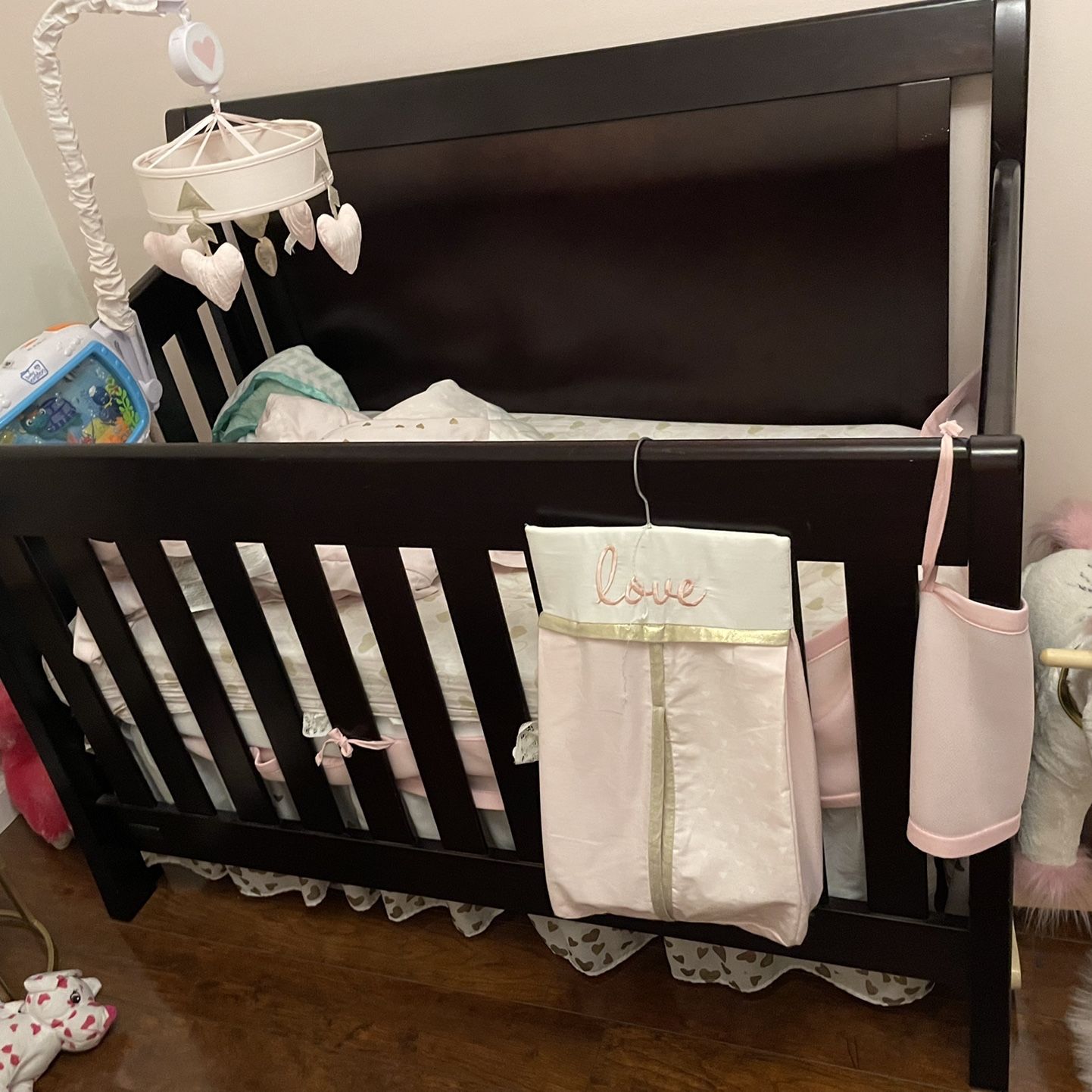 Espresso baby crib and mattress. Can be converted to toddler bed and full size bed with appropriate piece. Matching 6-drawer dresser with changing table attachment.